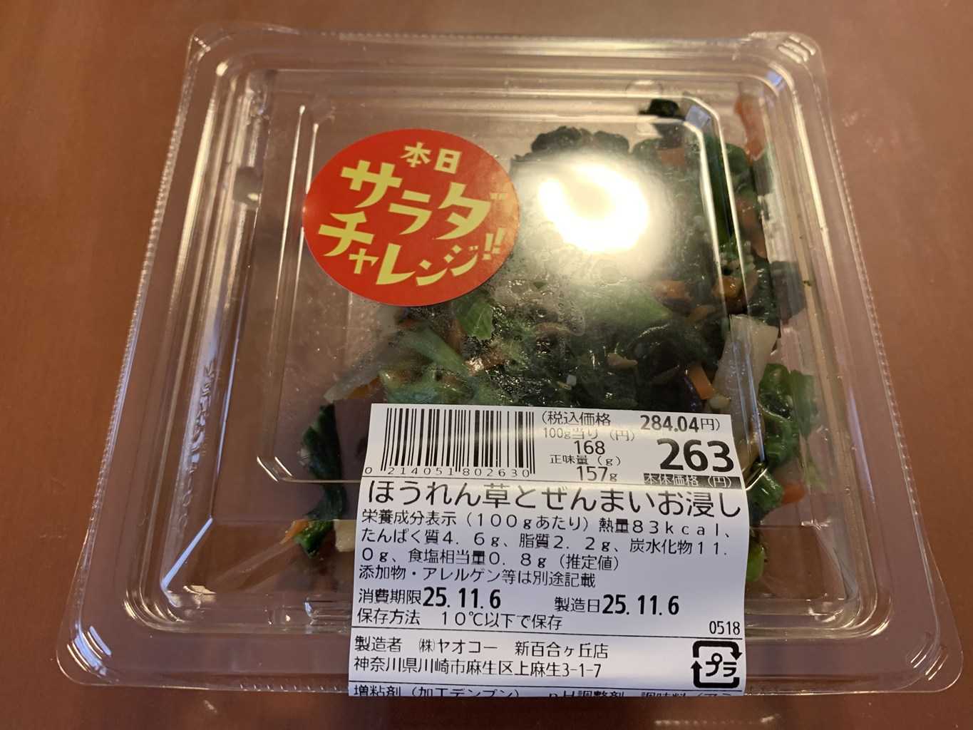 商品研究 「ヤオコー」の「ほうれん草とぜんまいお浸し」本体価格100gあたり168円 Pあたり263円を試食「ヤオコー」の「ほうれん草とぜんまいお浸し」本体価格100gあたり168円 Pあたり263円を試食します。ほうれん草、ぜんまいの他、青茎や人参など入っていてテクスチャのバリエーションがあり、うまい。
