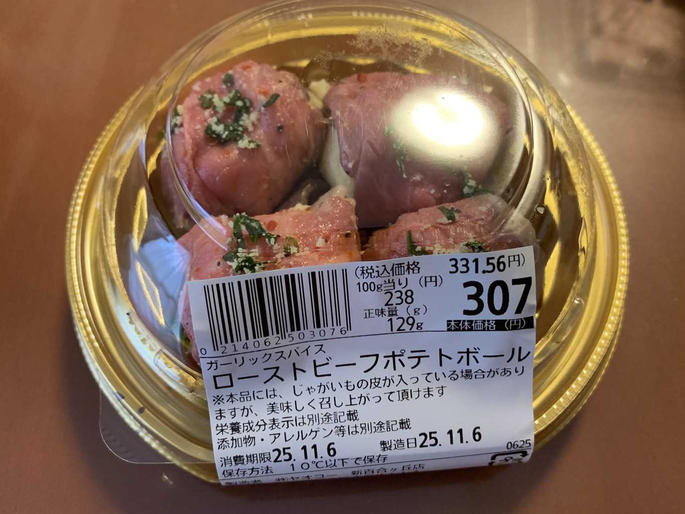 商品研究 「ヤオコー」の「ローストビーフポテトボール」本体価格100gあたり238円 Pあたり307円「ヤオコー」の「ローストビーフポテトボール」本体価格100gあたり238円 Pあたり307円を試食します。ローストビーフにマッシュポテトを巻いている。塩味でなかなかおいしい。