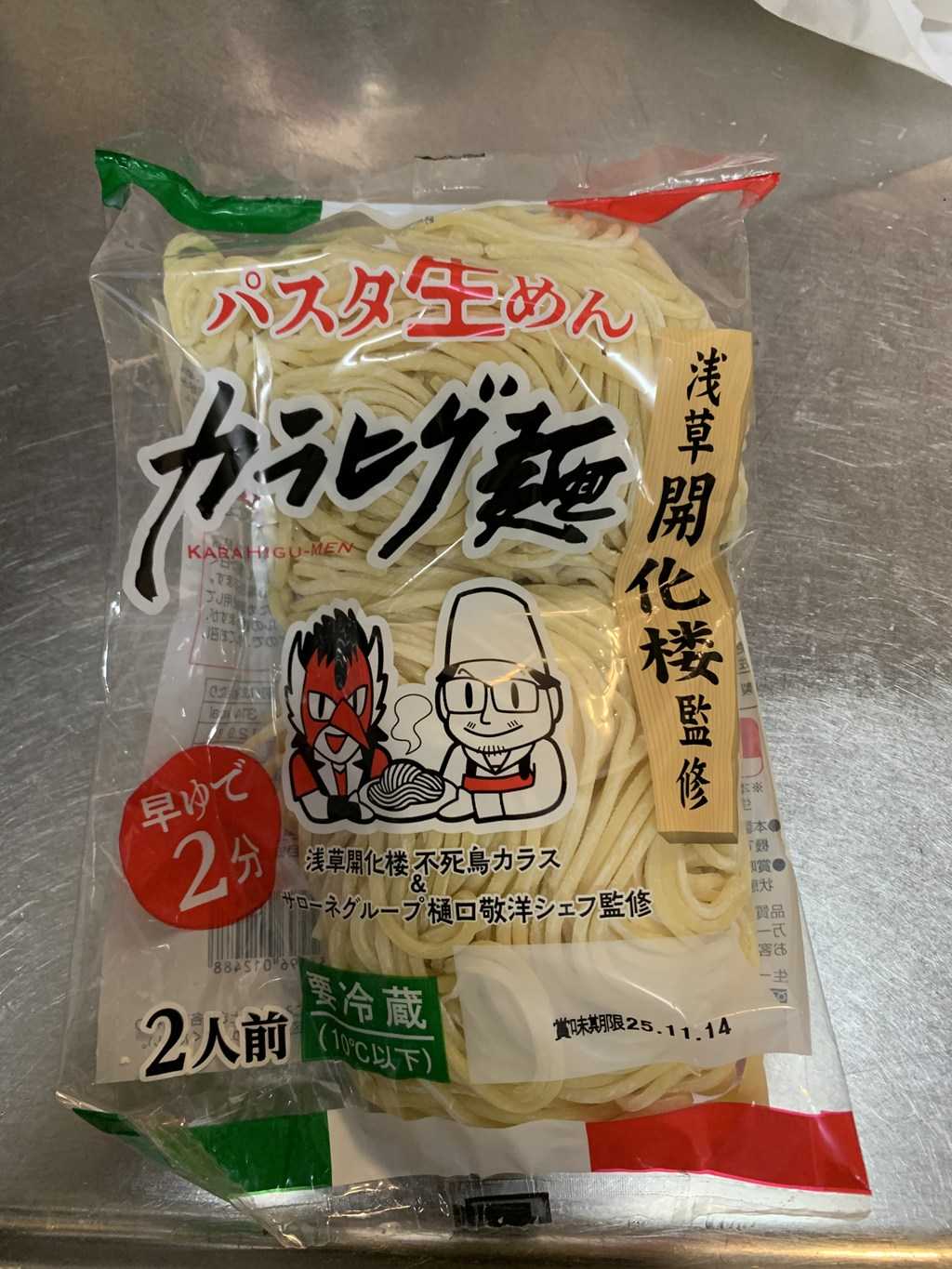 商品研究 「開花楼監修 パスタ生麺 カラヒグ麺」2食入本体価格199円というのがおいしいという投稿を見て、購入して試作して試食Instagramで「まいばすけっと」の「開花楼監修 パスタ生麺 カラヒグ麺」2食入本体価格199円というのがおいしいという投稿を見て、購入して試作して試食してみます。こちらもセットで紹介されていました。できあがり。麺、もちもちうまい。多分オイル系があいそうですね。カフェなどで使えそう。一応近いうち試作してみます。