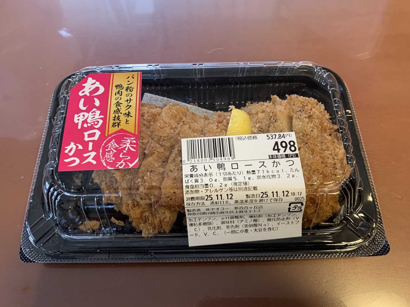 商品研究 「ヤオコー」の「あい鴨ロースかつ」本体価格498円が平台に陳列されていたので、購入して試食千葉に住むパートナーの齋藤さんから話に聞いていた「ヤオコー」の「あい鴨ロースかつ」本体価格498円が平台に陳列されていたので、購入して試食します。もっと鴨ぽい臭みがあるかと想像していたのですが、まったくそういう感じじゃないですね。身厚な鴨はふわふわ。サクサク、ふわふわ。これはさすが「ヤオコー」という感じですね。
