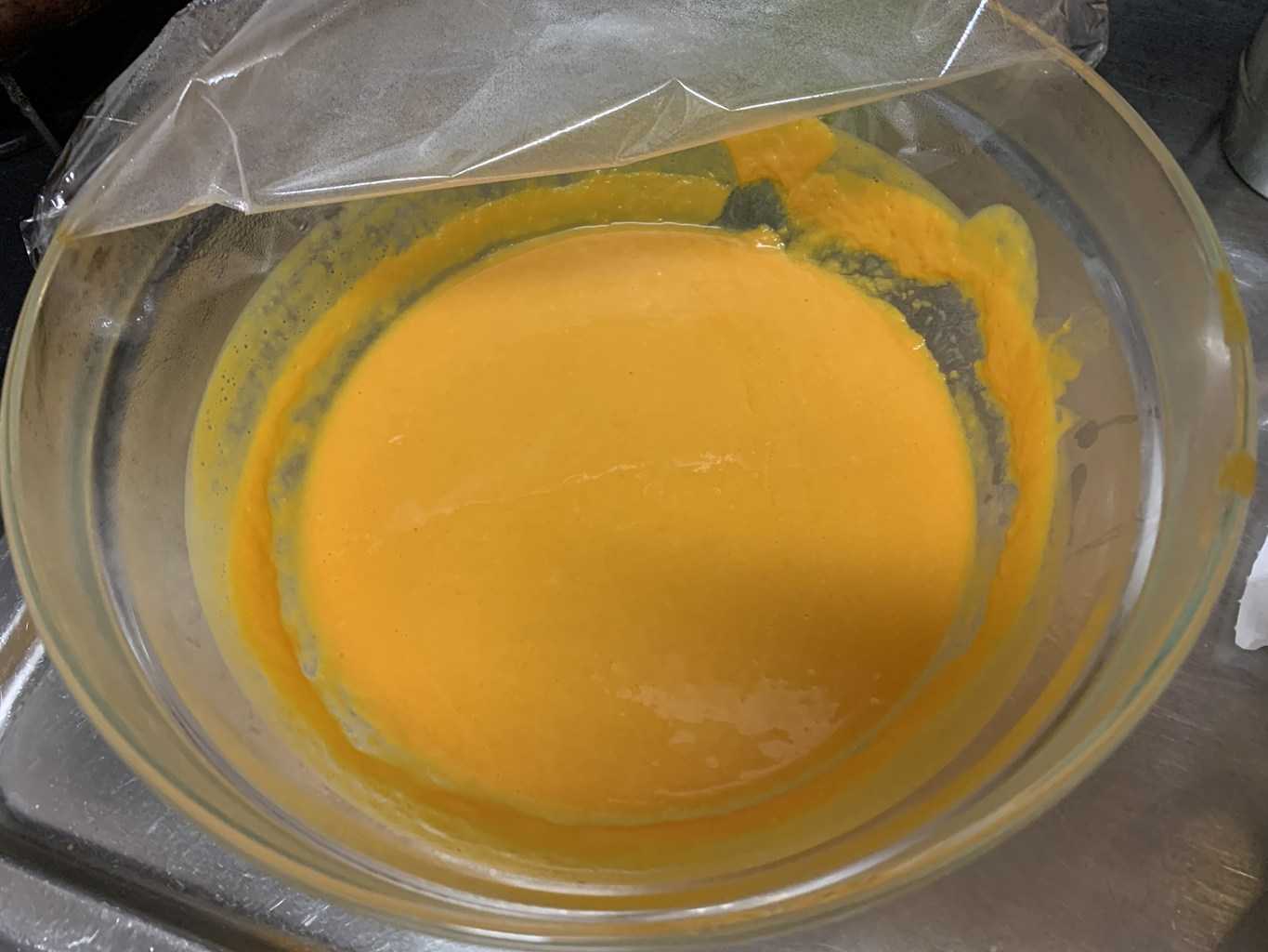 料理研究 バターナッツ南瓜で冷製ポタージュを試作バターナッツ南瓜で冷製ポタージュを試作しました。バターナッツかぼちゃひとつと玉葱を炒めて水150cc、マギーブイヨン2コを加えて煮て、バーミックスをかけて牛乳を加えています。