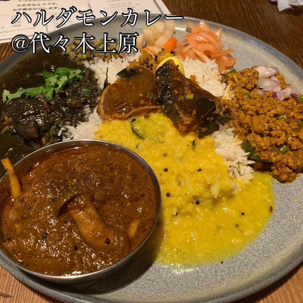 ハルダモンカレー @代々木上原 ~牡蠣カレーうまい 青山一丁目での打ち合わせの帰り道乗り換え駅の代々木上原で途中下車して「ハルダモンカレー 」の行列に並んでスパイスカレーの勉強をすることに。こちらが、入口 地階に店はあります。並んでいますね。待ちましょう。25分ほど並んで店内のテーブル席に案内されました。こちらがメニューで「本日のカレー」はA鶏肉のキーマ、Bポークカレー、C牡蠣のカレーの三種。単発、二種の組み合わせ、三種の組み合わせから選べます。また、トッピングもいろいろあります。 私の注文前にテイクアウトのオーダーのお客さんが入って、お料理の提供はやや遅めになりそうです。それで、20分ほどでカレーが到着しました。鶏肉のキーマ鶏は胸とモモの合挽きだそうで、べったら漬けが入っているとのこと。軽い口当たりでべったらの甘さなのか甘さ加減がとても良い感じ。昔、熊本の「洋食の橋本」のカレーに福神漬けを入れていたのを思い出しました。ポークカレーは三元豚とたっぷり玉葱のカレー。濃厚甘旨で、スパイシーです。牡蠣カレーは瀬戸内の牡蠣を使った季節カレー。イカ墨ベースで黒い。牡蠣、鯖?、浅利、あご、豚の出し。うまい。藁焼き鰹のアチャルをトッピングしたがなかなかおいしかった。付け合わせは、ひよこ豆、漬物2種類、うずらの玉子、黄色いソースなど全体的に好みのカレーでした。また、月を変えて勉強に来たいですね。帰りしな厨房からありがとうございました!と。おお!ジェームズオオクボ だとバレたか?なんてね。ハルダモンカレー〒151-0066 東京都渋谷区西原3丁目20−5 ファースト パティオ B1F電話 080-3554-0033