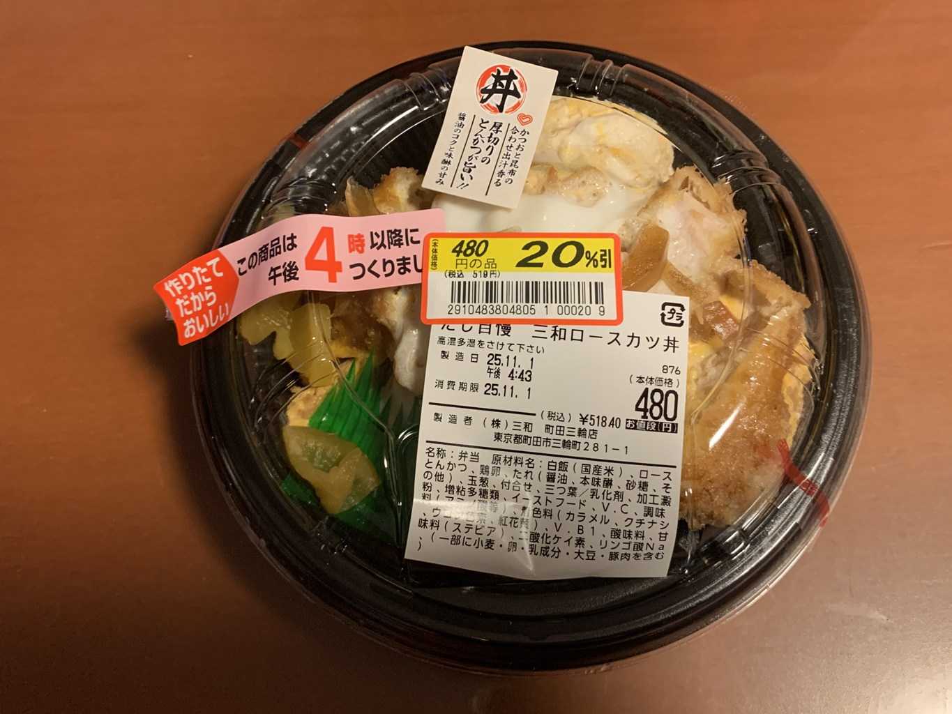商品研究 「スーパー三和」の「だし自慢三和ソースカツ丼」本体価格480円を定点観測で試食「スーパー三和」の「だし自慢三和ソースカツ丼」本体価格480円を定点観測で試食します。週末、夕方も攻めてますね。今日は連休初日で夕方の集客が延びなかったのか20%引きで販売、19時30分で売場に残がありました。