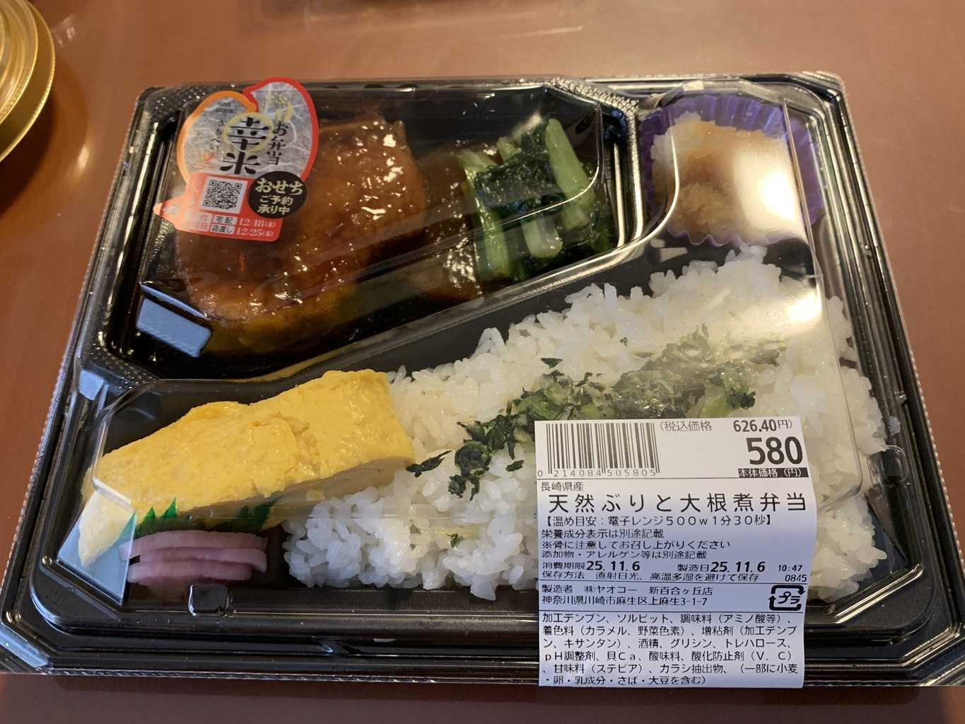 商品研究 「ヤオコー」の「天然ぶりと大根煮弁当」本体価格580円を試食「ヤオコー」の「天然ぶりと大根煮弁当」本体価格580円を試食します。立冬前日の売場にて。小松菜の油炒め、おろし、鉄板厚焼き玉子、桜漬け、野沢菜ふりかけある意味定番+鰤大根ですね。粉を打って油で揚げてタレをかけたか。