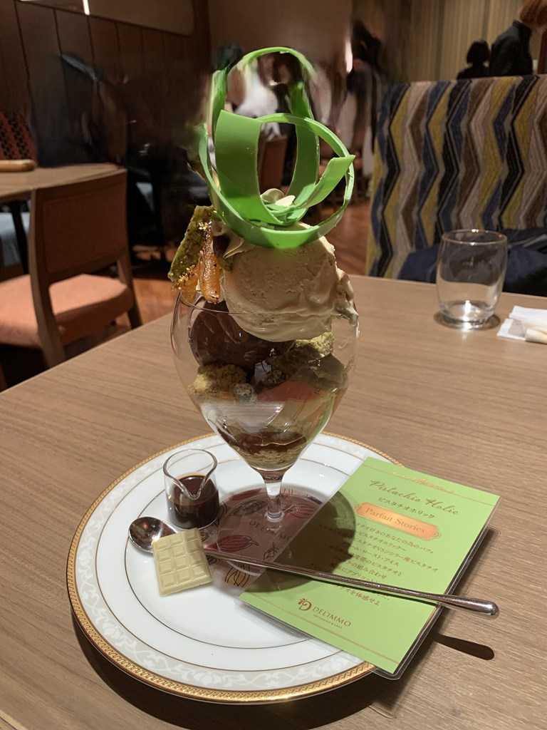 パティスリー&カフェ デリーモ 麻布台ヒルズ店 @麻布台ヒルズ地階1階ガーデンプラザB ~ピスタチオ好きのあなたのためのパフェ 長野の原さんかおやきの試食会をするので来れませんかと連絡がありました。何アイテムか、試作品が出てくるのだろうと。それで、ランチもどこかで勉強になる店に行きませんか?とのことです。それで、おやきカフェの参考になるかは別として、こいけさんのInstagramの投稿でモンブランパフェが気になっていて、麻布台ヒルズにある「パティスリー&カフェ デリーモ 麻布台ヒルズ店 」予約しました。予約するにはフードと菓子(とドリンクだったかな)の注文をお願いしたいとのことですが、もともと、その勉強が目的だったので、予約できるのは良かったです。 まずホームページのコンセプトを見ると、「パティスリー&カフェ デリーモ 麻布台ヒルズ店 」には”ショコラティエの創るパティスリー”チョコレートに魅せられショコラティエとなった江口和明がその魅力を余すことなく伝えるべく立ち上げたパティスリー。ヨーロッパで洋菓子の奥深さに触れ、さらにカカオの虜となったことで生まれた素材を生かし切ることに対するこだわり。その情熱がデリーモのアイテムには詰まっています。と書いてあります。続いて、ショコラティエの江口和明さんのページ(https://kazuakieguchi.com/)をめくるとシェフのこれまでが書いてありまして、製菓専門学校を卒業後、「渋谷フランセ」に入社。 その後、東京、神戸の高級チョコレート専門店にて研鑽を積む。ベルギー本店で研修後、日本に初上陸した「デルレイ」のシェフに就任。六本木ミッドタウン「NOKA」、「ベルベリー」また「モトヤマミルクバー」 「シルビウスブラボー」などの他業種の商品開発を経験 26歳の時に最高のサーヴィスと経営を学ぶべく株式会社グローバルダイニングへ 「デカダンスドュショコラ」等、販売から製造を一手に統括。2013年のデリーモブランド立ち上げ時よりシェフパティシエ/ショコラティエに就任詳細はこちら(https://kazuakieguchi.com/profile/)さて、店を見つけるのに苦労しましたが、少し遅れて到着しました。それで、リッチなベンチシートに案内されました。となりには三世代のご家族のようでなかなかお子様が小さくて賑やかでした。考えてみるに私の子供も同じような年齢を経過したのですが、シェフ達が気を使ってくれて個室にしてくれたりなどと、今思えば感謝ですね。 さて、メニューをチェック。さて、今日は「ルーベンス・スープレックス」税込1,700円とこいけさんが発信していたモンブランパフェは月が変りなくなっていて(さすが)、“ピスタチオ好きのあなたのためのパフェ”「Pistachio Horic」税込3,168円とアッサムゴールド税込792円を注文します。ドリンクと何かを同時に注文するとセット割引があるらしく会計時に200円引きになっていました。原さんは「白トリュフ香るボロネーゼ(サラダ付き)」税込1,760円とグランドメニューのパフェを注文していました。まずは、原さんのパスタのサラダが到着。「ヤオコー」の惣菜売場のサラダにキヌアが使われているので商品化を考えてましたが、キヌアの使い方が勉強になります。続いて、私の注文したルーベンス・スープレックスが到着しました。中にはとろけるチーズとコンビーフとシュクルートと玉子が入っています。パンのテクスチャのあと、全方位的な味わいがとてもうまっいサンドイッチです。フォークとナイフでは少し食べにくいですが、付属の袋に入れてハンバーガーのように食べるようです。原さんのパスタが到着。麺がおいしいそうです。だよね。それでいよいよメインのパフェが到着しました。数年前、モンブラン専門店を立ち上げヒットした会員さんから業態のアイデアを聞かれてカヌレ専門店かパティシェのつくるフルーツパフェでしょうと提案しまして、地元の隠れた名生産者の果実を集めてフルーツパフェ屋を始めました。それ以来、私もアイデアのストックと何を聞かれても応えられるように日頃勉強をしているわけです。さて、あらゆる温度帯のピスタチオが楽しめるという江口和明シェフのパフェはどうでしょうか実食します。まず、ショコラハーツを手に取りいただきます。さすが、ショコラティエの江口シェフのチョコレートだけあってのっけから違います。おいしい。チョコレートのソースは途中でかけるそうです。あと、ピスタチオのチョコレートのバープラリネピスターシュとローストピスターシュクイームの後、ピスターシュのアイスを食べたのだが、これがうまいのなんの。パフェをいろいろ食べるが、どうもソルベやアイスクリームがかなり重要だ言うことに至っていたのだが、これはそれを確信に変えますね。それで、その下のショコラピスターシュのアイスクリームがこれまたおいしい。ここで途中でかけてくださいというチョコレートのソースをかけてみます。よくあるのは味変と称して提供されたソー