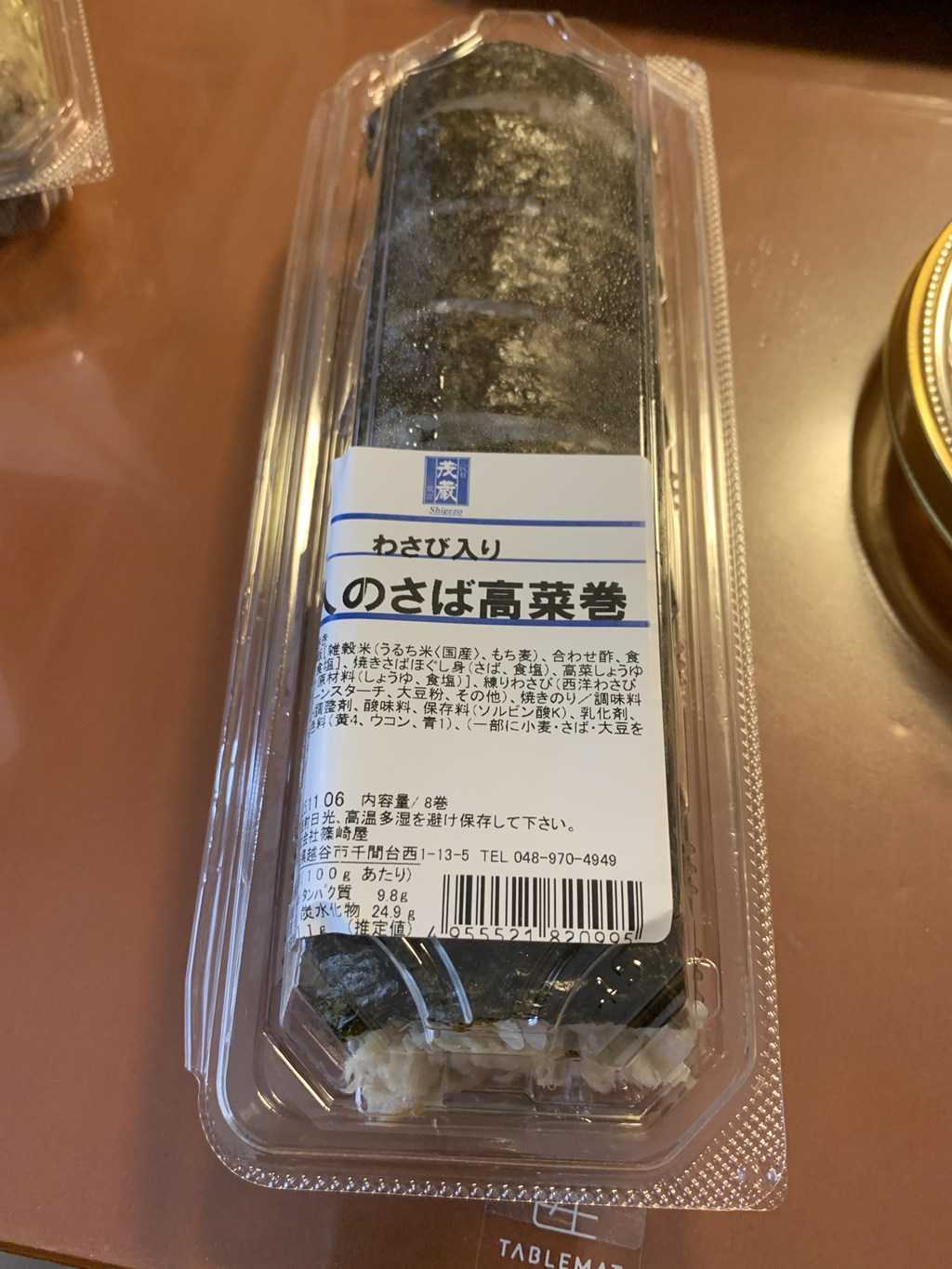 商品研究 「茂蔵」の「わさび入り のさば高菜巻」税込259円を試食「茂蔵」の「わさび入り のさば高菜巻」税込259円を試食します。野沢菜を芯に鯖のフレーク、そして大量の山葵をまいています。意外にうまい。