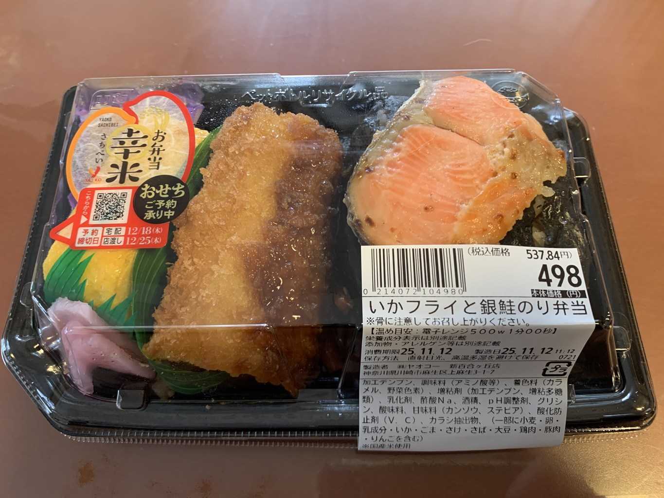 商品研究 「ヤオコー」の「いかフライと銀鮭のり弁当」本体価格498円を試食「ヤオコー」の「いかフライと銀鮭のり弁当」本体価格498円を試食します。少し見た目のボリュームが少ないように見えますが・・・ソースをかけたいかフライの下にはテクスチャがある皮つききんぴらが、鮭は西京焼き、のりの下というかご飯は削り節のしっかりふったおかかのおにぎり様になっています。実際食べるとさほどボリューム不足には感じないですね。