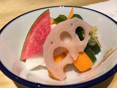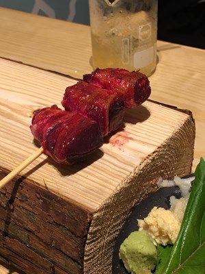 とろける人参の串は2時間蒸した人参に豚肉を巻いたもの。バルサミコのソースがついていてなかなか。