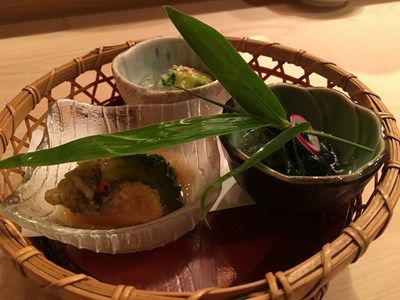 鱸カレー風味と沖縄苦瓜、キュウリのソースの心太、金時草やモロヘイヤなどお浸し