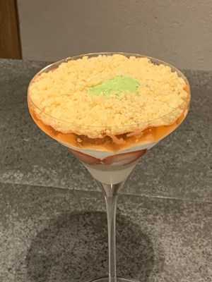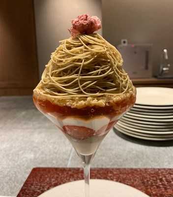 まずは桜のパンナコッタ、和栗のクリーム、静岡産「紅ほっぺ」、丹那ヨーグルト、自家製サクサククッキー、抹茶のアイスクリーム、生クリームが盛り付けられました。