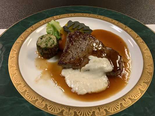 アンガスビーフのステーキ(+3点)、オリエンタルソース、オニオンクリーム