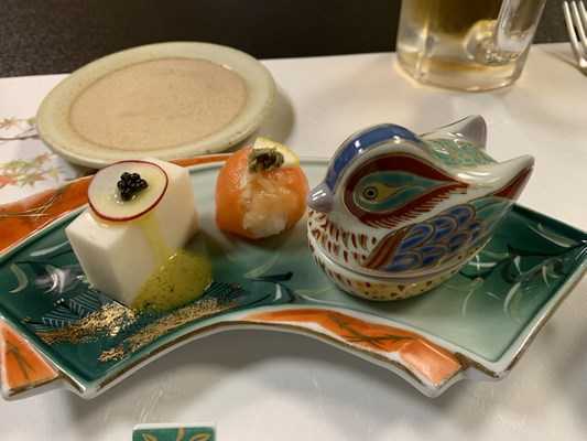 前菜はふぐの白子豆腐(+15点)・マスタードソース・キャビア(+10点)のせ、ふぐ(+10点)のタタキ・鉄皮・ポン酢ジュレ、スモークサーモンの手鞠寿司 合計40点