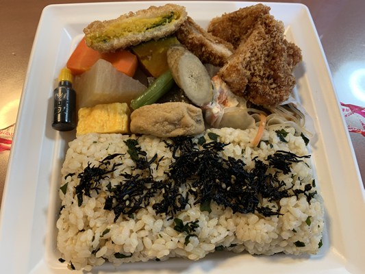 チキンカツ、春雨の和え物(○)、ポテトサラダ(○)、大根煮、人参煮、南瓜煮(○)がんも煮、玉子焼き(△)、かぼちゃコロッケ(○)