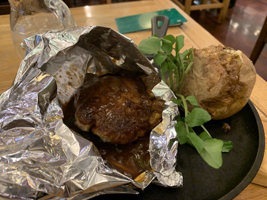 アルミホイルを開けるとデミグラスソースのハンバーグが出てきました。