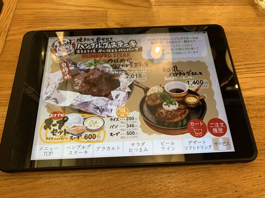 つばめ風ハンブルグステーキ本体価格2,220円とトマトサラダ本体価格490円、スープセットをライスで660円を注文します。