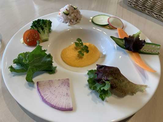 綺麗に盛り付けてありますね。五穀サラダやお野菜、お野菜の下にはカレーが敷いてあり、食欲をそそりますね。