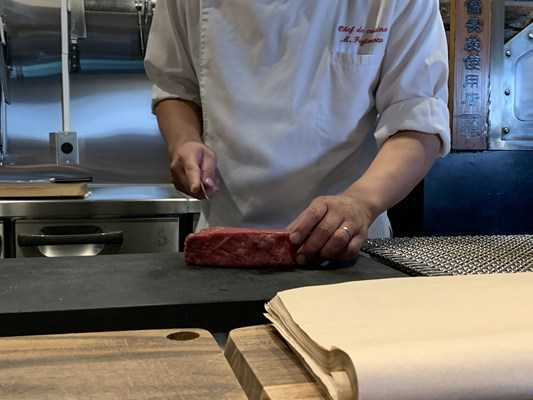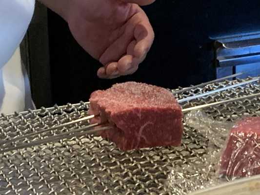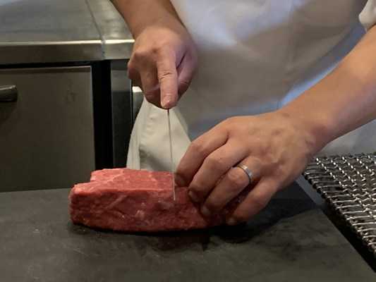 藤本シェフに挨拶すると、今日は何グラムにしますか尋ねられ、200gでと、今日も、おまかせ神戸牛ランチ200g税込8,800円にしました。