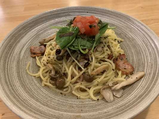 きのこと吊るしベーコン・トマトのバジリコペペロンチーノ