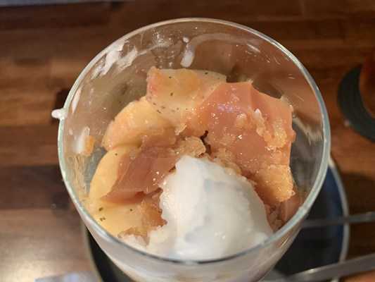 カットした桃たちと下にあるクリームと混ざってなかなかおいしい。