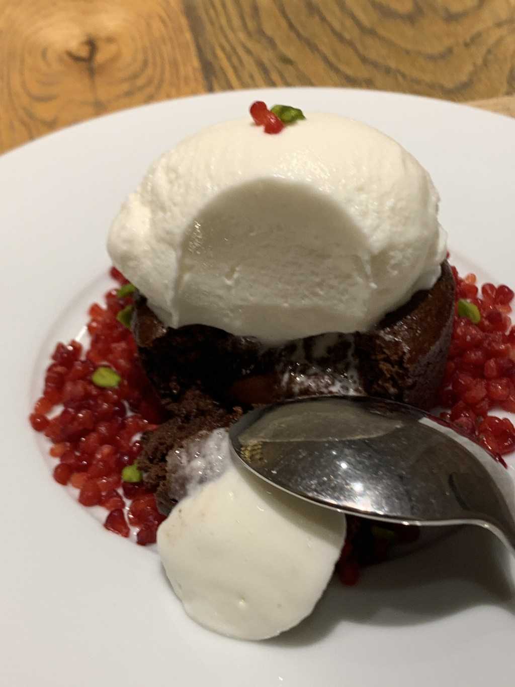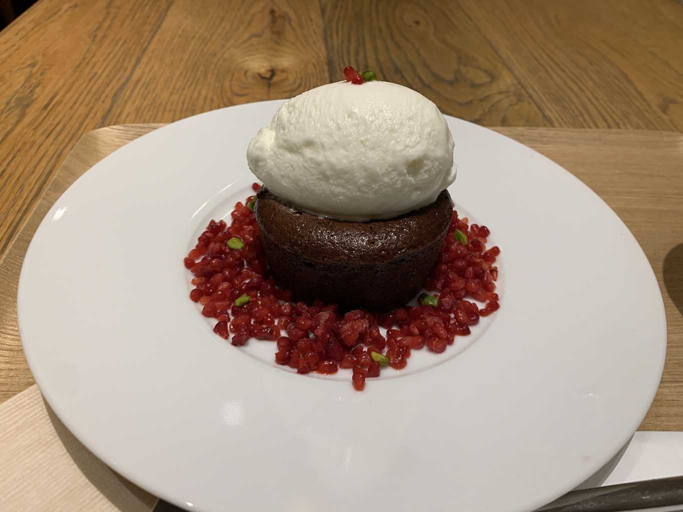 ガトーショコラには見るからになめらかなアイスクリームがのっていまして、ラズベリーのつぶつぶが下に敷かれていて白、黒、ワインレッドのコントラストがきれいでおいしそう。