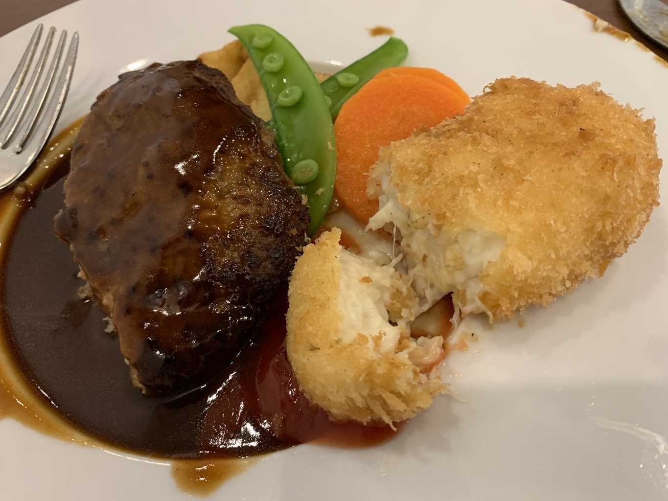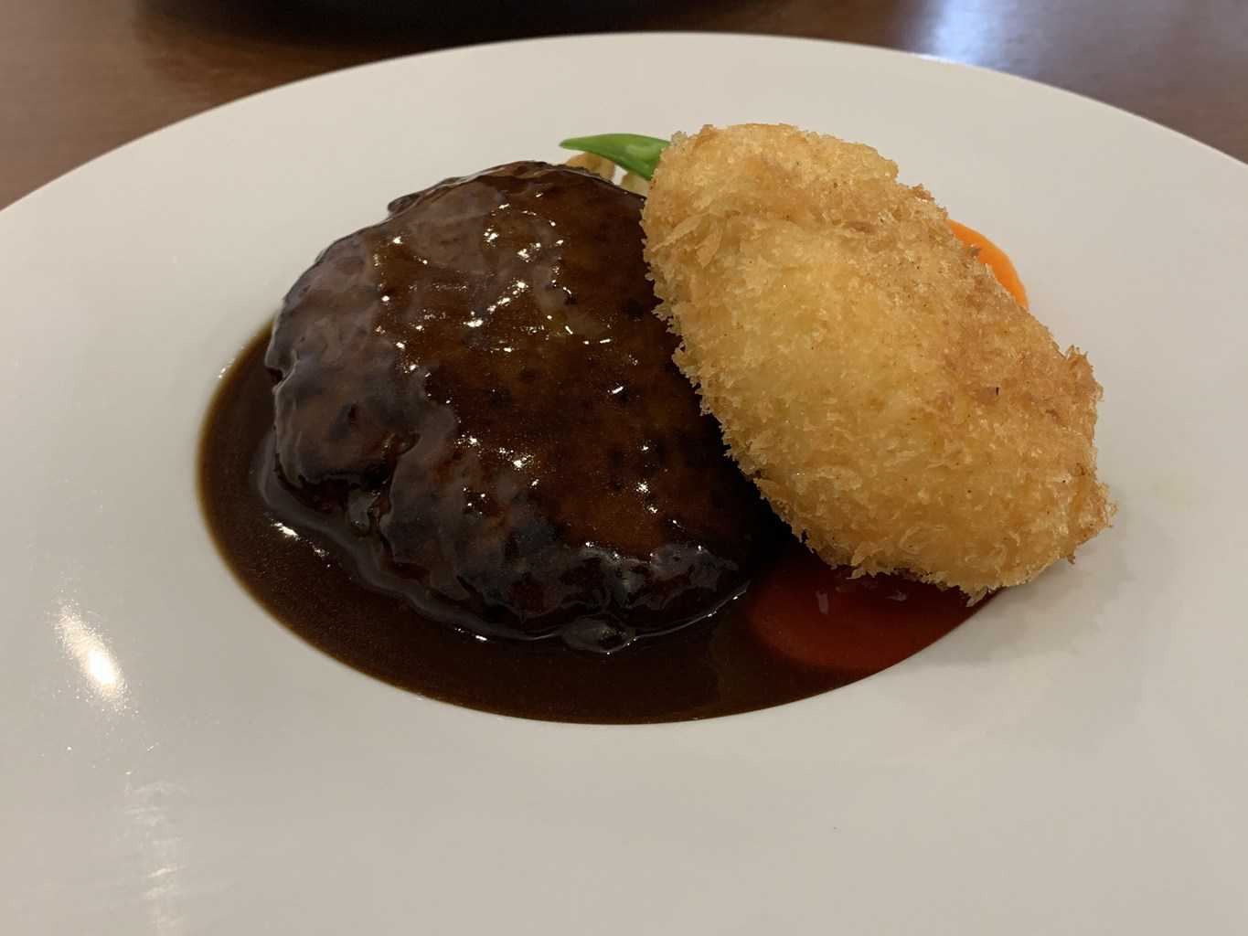 昔、「新宿さぼてん」にいたころ、シーズンアイテムでラインナップした帆立クリームコロッケが好きだったので、帆立クリームコロッケが気になったので、ハンバーグとコロッケのセットをチョイスします。