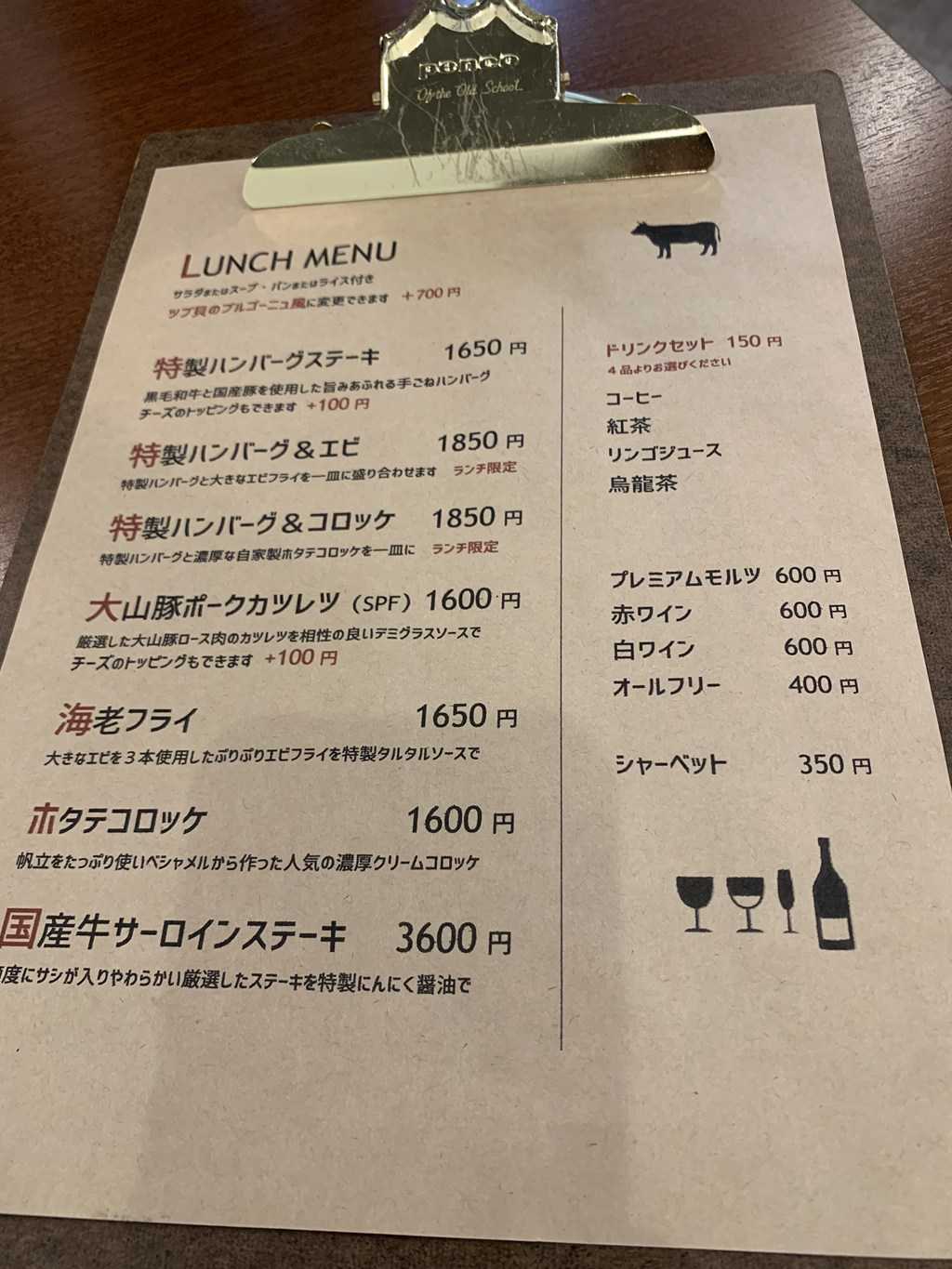 メニューはハンバーグ、海老フライ、帆立クリームコロッケ、国産牛ステーキの組み合わせのラインナップです。