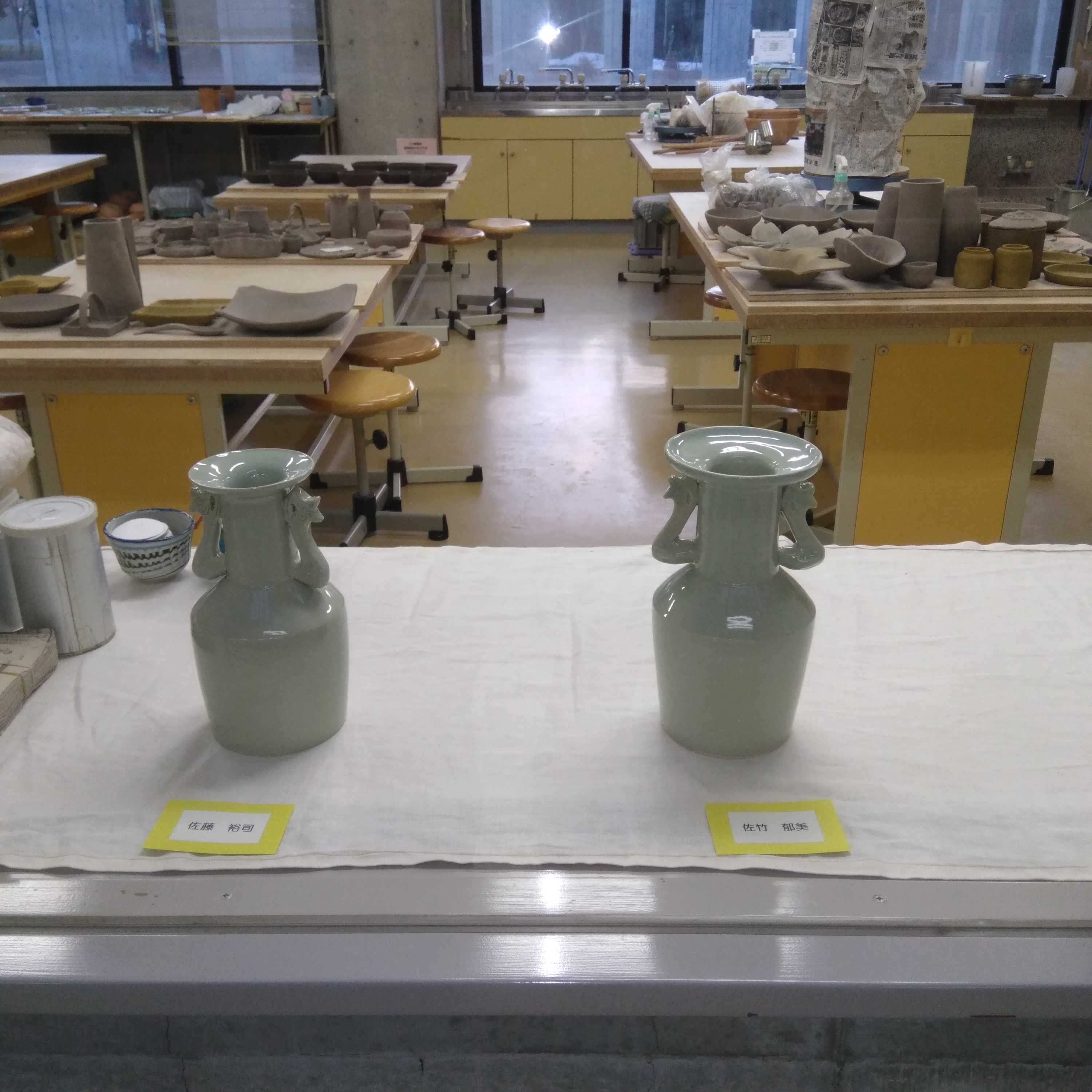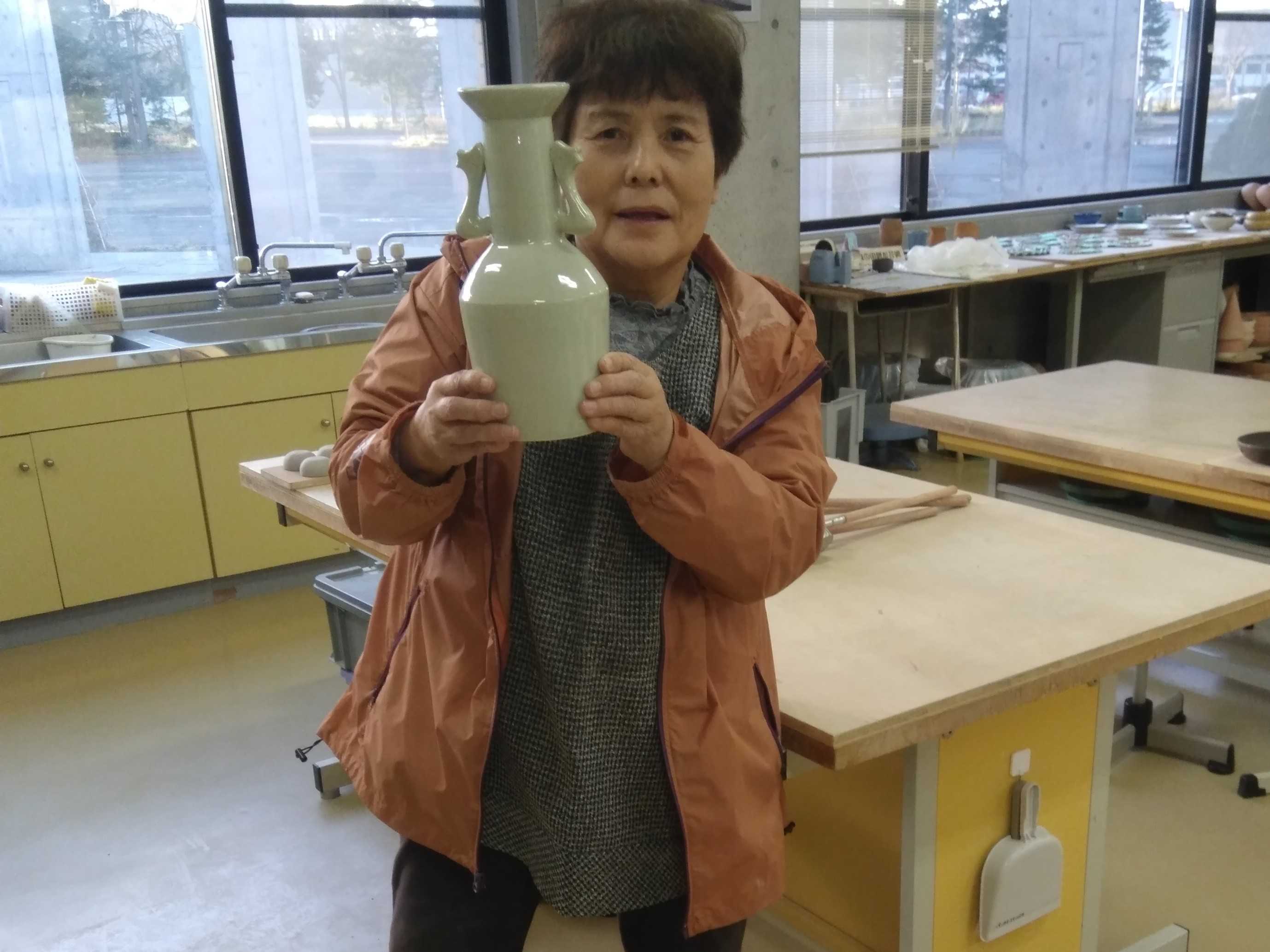 セラミックアートセンターに行くと、中級ロクロ教室で作成した「青磁鳳凰耳花生」の作品が展示されていて少し心が躍りました。