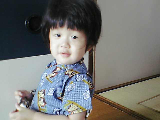 最近の駿冶はこんな感じ写真がデカ過ぎた~(笑)たれ目でじいじに激似小さい時のあたしと妹を足して2で割った感じ手に持っているのはあたしの車のキーこれをどこかに隠す(本人はしまっているつもり)クセがある『駿冶こっち向いて』と言った時に振り向いた一枚お祭りん時の写真この甚平、90センチなのに駿冶には小さい・・・最近ぐんぐん大きくなってきて身長85.1センチ、体重12キロになった出生時は身長50センチ、体重2550グラムのちっちゃめ赤ちゃんだったのによく食べ、よく動いて、よく寝るので2歳児ではなく3歳児に間違われるほどに男の子の兄弟がいなかったから男の子の足の大きさには驚いた、駿冶は16センチ(実は元旦那が身長190センチで足のサイズ30センチだったから遺伝なのかもしれない)ちなみに駿冶は女の子が大好きで、好みのタイプは綾瀬はるか(笑)かなりの面食いポカリスエ○トのCMにやたらくぎづけになるので『駿冶、綾瀬はるかってね、ママと同じ年なんだよ』と説明したらしょんぼりしてたけどホントのことだもん駿が大きくなったら綾瀬はるかおばさんになっちゃってるよ~他にもかわいい子がテレビに出ると近づいてチューしてます