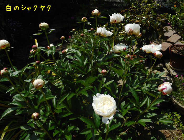 いつも前の日の晩御飯のおかずで翌日の私の朝食のお弁当を作っているのですが、今回は、小松菜の緑とキュウリの緑が入っています。左側には、まず薄くご飯を敷いて、その上にしっかり味のついた厚切りの豚肉と、汁気を切ったもやし・小松菜炒めを載せています。豚肉は外側をカリカリに焼いたので、翌朝でも、とっても美味しかったです。あ、もちろんレンジで温めてから頂きましたよ。右側は、母が大量に作っていたポテトサラダの一部。茹でたちくわとウインナー、そして大根の薄切りも入っています。さすがに、これ全部食べるとお腹いっぱいになるので、サラダは半分残しておいて、お昼にサンドイッチにしました。パンはいつものように6枚切りを半分にスライスしてからはさみましたよ。それと、チーズと牛乳の昼ご飯。お腹一杯になりました。今夜は、ブリのアラを生姜入りで甘辛く煮る予定です。つまり、それが明日のお弁当のおかずね。今日は、母が久しぶりに整形外科に行きました。10年前にひざの人工関節の手術をしていたので、その検査です。で、庭に出たので写真を撮りました。シャクヤクは、来週にはもう全部散るのかなぁ。バラは可愛いね。ピンクの濃淡のバラも可愛い。ミミエデンも、少しだけ開きました。モンシロチョウが来たので写真を撮っていたら、アオスジアゲハも飛んできましたよ。見えますか?ここです。今日はあっという間に、どこかへ行ってしまったので、写真はこれだけ。たくさんのお人形がぶら下がっているような花、ユキノシタが可愛かったので、1本だけとってきて、パソコンの横に飾りました。 あまり目立たないけれど、派手なライトの横だから、いいことにします。