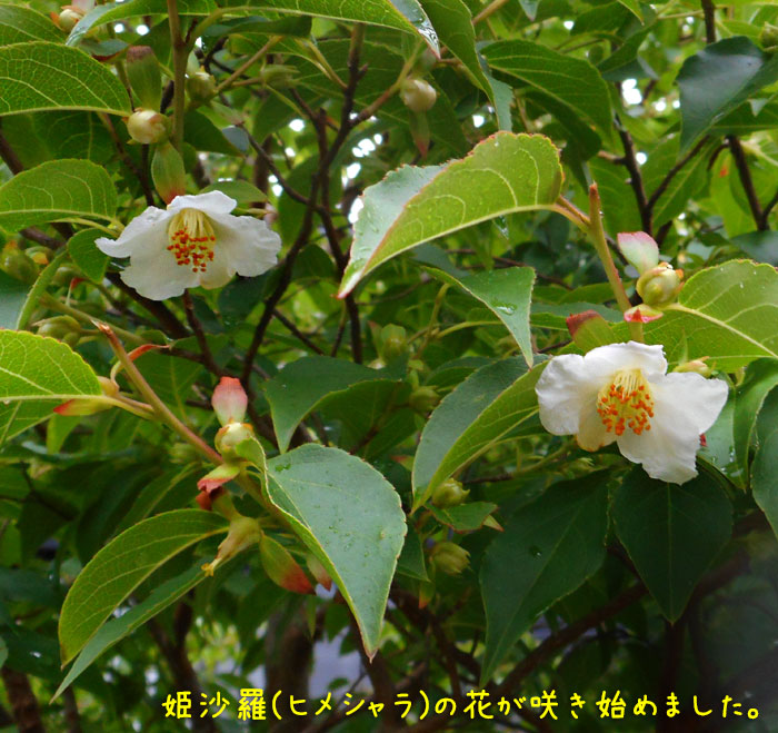 母に、年金を下ろしてくるように頼まれたので、小雨の中家を出ました。すると、まあ、姫沙羅が咲いています。すでに散っている花もありました。ちょっといびつですが、可愛い花です。これは、5月20日に撮っていた写真。枝の途中、葉っぱの付け根あたりに、二枚の小さな葉っぱがついていて、端っこが赤くなり、真ん中に丸いつぼみ。すぐに見つかります。この姫沙羅の木の反対側では、ヤマアジサイの「くれない」と「土佐緑風」が咲いています。毎日、赤い面積が増えていきます。土佐緑風も、黄緑から、どんどん違う色が出てきますね。この土佐緑風は、2009年の6月14日に、植物園の山野草展で買ってきたもの。その時の日記があります。 2009年6月16日の日記この時の日記の写真を見ると、だいぶ感じが違うみたい。なんか、花びらが平面です。不思議・・・うちの土で、こんな風になったのかな? 2012年5月20日の日記この時は、もう地植えにしてもらっていたのかな?では、今日の朝ごはん。ほうれん草はあるけれど、地味弁ですね。ほとんど茶色。だから、飲み物は青汁にしました。餃子は、旦那と息子たちは、一人12個ずつ。私のお弁当にはそんなに入らないので、8個です。ところで、たまご豆腐と茶碗蒸しって、よく似ていますよね。違いは何かしら・・・具が中に入っているかどうかだけの違い??? 前々からの疑問です。名前が全く違うけど、よく似ているような・・・ ゼリーとか寒天で固めてあるわけではなさそう・・と思ったら、具が入っていて、味が濃いめで柔らかいのが茶碗蒸し、具無しで薄味、硬めなのがたまご豆腐なんですね。作り方は同じでした。これでスッキリ!!