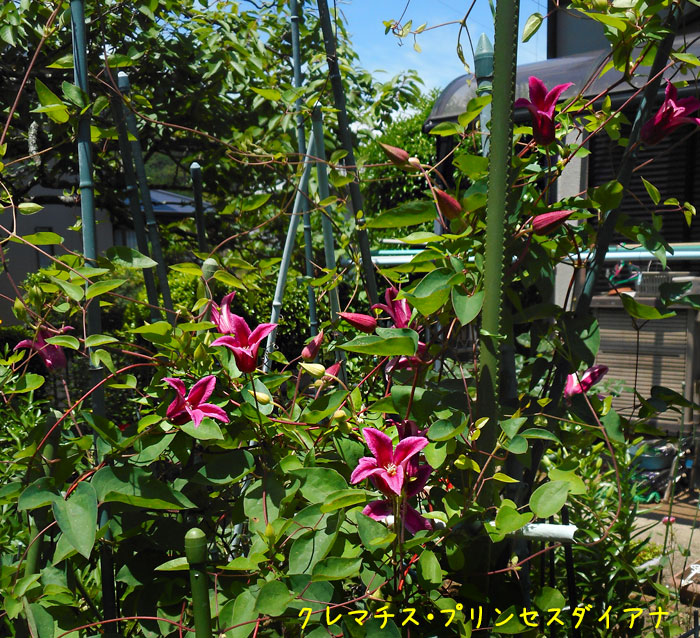 咲き始めているのは知っていたのですが、今日見たら、本当にたくさん咲いていました。それは、クレマチスの「プリンセス・ダイアナ」母を美容院に送っていく前に撮ったのが、この写真です。もう真夏のような日差しの中で、ちょっぴり大人っぽいピンクの花が、見事に咲いていました。ここからは、帰ってきてから、一眼レフで撮った写真。今日は、ダイアナ妃の次男、ヘンリー王子の結婚式でしたので、特にたくさん載せました。お祝いに、華やかな花もね。このバラは、私が19歳の時にこの家に引っ越してきた時に、すでに植えられていたバラの生き残りらしいです。西側の庭と、生垣のところ、そして庭の中央付近に、そのころのバラが残っています。では、おまけの写真です。 何がおまけかわかるかな?はい、これ。初登場、旦那の車です。普段は、早朝4時過ぎ、5時くらいまでには出勤してしまい、帰宅するのが夜の8時なので、なかなか明るい時に見ることがありません。今日のお昼に、母に頼まれて美容院に送っていこうとした時に、たまたま旦那が帰ってきて、先日買ったばかりの新しい舟(シーカヤック)を車の屋根に積み込んでいたのでした。「あの新しいので、今度の大会に出ると?」と尋ねたら、「いや、あれは難しい。今までのを使う予定」と言っていました。新しい舟は、まだ慣れていないらしいです。わざわざ外国に発注して、自宅には配達されなかったので、奥多摩まで車で受け取りに行ったという舟です。往復で2,300km走った・・・と言っていました。私の車が4年間でやっと6,000km走ったのと、えらい違いですね。