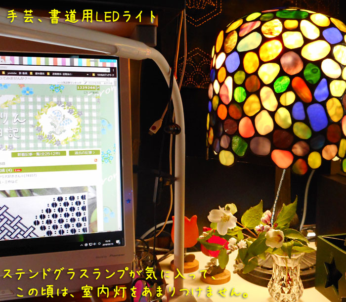 いろんな模様があるので、どれと組み合わせようか・・・と悩んでいました。で、ようやく決めて、今日はここまで。唐草模様みたいな感じですね。もとにしたのは、これ。本当は、このまま真似しようと思ったのですが、私の場合、ななめに空白をあけていたから、斜めに模様を入れていくことになります。すると、この図案では、上向きと下向きが交互になっていて、どうにもわかりにくくなったので、全部同じ向きにしてしまいました。で、4目ずらすように書いてあるけれど、5目ずらしました。(斜めの線の上に5目あけていたのだけど、模様自体は、11目ずれていました。)糸の色も、二色に・・・さて、刺し終えたら、何に使うかなぁ。そうそう、使った本は、この間のとは違います。これ。「きもの模様」のクロスステッチ。いろんな色の糸で、きもの模様ができあがっています。一色だけでなく、組み合わせた物も。こういう模様の布は、すぐに手に入りますが、自分で刺すと愛着がわいて、長く使うことになります。また、プレゼントにもいいかもしれませんね。それにしても、最近、がんばり過ぎたのか、筋肉痛が。それで、こんなの持ってたなぁ・・と思い出して、久しぶりに使いました。中にはこんなものが入っています。ピンクやオレンジのもあるみたいですが、この黄緑色のがお豆みたいな形にぴったりですね。というわけで、昨日から、この低周波治療器でぴくぴくを楽しんでいます。では、最後に今朝の地味弁を。右側の、煮込みうどんの汁の中には、ちゃんと野菜も入っているのに、見えませんねー。具は、もやし、ぶなしめじ、キャベツ、ちくわ、きくらげの天ぷら、味付け薄揚げです。皆が食べた物には、あと丸天とうどんの麺が入っていましたよ。おまけのおかずだった鶏の手羽元の山賊焼きと小女子の佃煮も美味しかったです。ここから、追記。昨日の「上海ローズ」は、ここに置いています。いろいろ調べてみたら、室内でもLED照明を日中ずっと当てていたら、多肉植物でも育つらしいとわかりました。この「上海ローズ」は、日光が好きで寒さに強いから、外に置くのが良いらしいけれど、それでは私が観察できませんからね。できればパソコンの横に置いておきたい!!測ってみたら、電球からの距離が15cmでした。LEDですから、熱くはなりません。この状態で、ちゃんとランナーが伸びて、周りに子供を増やそうとするかなぁ。実験中です。(夜は消すけれど、日中はずっとつけています)