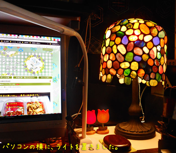 昨日、タンスの上から降ろしてきたステンドグラスのランプは、パソコンの横に置いて使うことにしました。長いこと使わないまま、置きっぱなしにしていたのが申し訳ない。これからは、すぐ近くに置いて、この光の色を楽しみたいと思います。さて、ランプの話。私は本当は「ティファニーランプ」が欲しかったの。ティファニーランプというのは、こんなのです。ティファニーランプについては、こちらのサイト「一生一石」の中で詳しく紹介されています。ティファニーといえば、ブライダルジュエリーなどのイメージが強いと思いますが、ランプやステンドグラスなどのガラス製品は、ティファニー創業者の息子さんに関係あります。ティファニーの跡取り息子だったのに、室内装飾に興味を持ち、「ティファニー・スタジオ」を作りました。「家の中に美しい品を置きたい」人たちの需要に応えて室内装飾品を考案したそうですよ。最初に発売されたのは、1895年。当時の品はもう手に入らないと思いますが、似たようなスタンドは今でもたくさん売られています。あっさりしたデザインなら、1万円台からありますが、私が「いいな、ほしいな・・」と思ったのは、30万円から50万円くらいの値段がついていましたよ。とても買えません。せっかく買っていたこのランプを、大事に使っていくことにします。ステンドグラスもいいですよね。教会に入った時など、ステンドグラスから光が差し込むと、本当に美しい。さすがに、自宅にステンドグラスを取り付けるのは大変なので、こんなの買いました。ティファニーのステンドグラスの写真がたくさん使われている住所録です。 もったいなくて、全く使っていなかったのですが、メモページを外してしまって、額などに入れて楽しむことができるようにしたものです。この中のどれでもいいので、私の部屋の窓に取り付けたいなぁ・・・でも我慢がまん。あら、今日の記事は、ますますカラフルになってしまいましたね。そろそろ庭の消毒が終わった頃かな? 見てこよう。