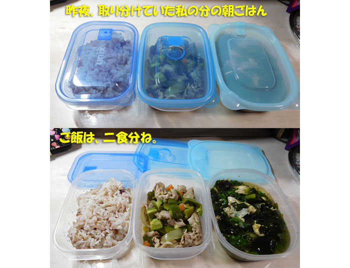 11月半ばには年賀状をすでに購入していたのに、まだ出していません。というか、まだ書いていません。昔忙しかった頃は、大晦日の紅白歌合戦を見ながら、表書きを書いたりしていたけれど、今は閑なのにねー。というわけで、まずは腹ごしらえ。夜食べないので、朝はお腹がすいているのです。家族に晩御飯をよそうときに、私の分は、このように保存容器に入れて、二階に持って上がるのですよ。このまま食べるのは、なんか味気ないので、いつものお盆(滑り止めつき)にセッティング。お吸い物は、いつもワカメとか季節の野菜を入れるので、具沢山になってしまいます。ご飯は、一度に全部食べると多すぎるので、残りはお昼ご飯の時にいただきます。では、いよいよ始めます。年賀状関連の箱に、だいたい使う物はまとめて入れてあります。この間の墨彩画教室で、年賀状作りをした時に、せっかくだからと作った消しゴムハンコも使います。今年の基本デザインは、これです。左上のあいているスペースに、ご挨拶や近況を書きこみます。表書きは、印刷ですませたことはありません。プリントゴッコを使っている時代は、裏面だけの印刷でしたから、当然ですが、パソコンを使い、プリンターで印刷するようになってからも、表書きだけは手書きにしていました。表書きが印刷してあると、(「筆まめ」とか「筆王」などに登録してあるから、ついでに印刷して送ってくれたんだろうな)という気持ちになって、ありがたみが薄くなるのですよ。というわけで、これからいろいろ手書きで書きます。そうそう、このプリントゴッコについていたハガキ乾燥具は便利で、ずっと使っています。パソコンを使う前は、ずっとこれで作っていました。ランプはまだ残っているけれど、原稿を焼き付けるマスターがもうないですね。あ、インクも捨てたっけ・・・これも処分しないとね。そう思いつつ、なんかそのまま持っています。これで日記を終了するのも何だったので、思い切って、プリントゴッコを分解して、燃えないゴミとプラゴミに分けました。そして、入れ物の段ボールも分解。昔の物だから、ごっついホッチキスで留めてあり、外すのが大変だったよー。でも、すっきりしました。なんか、せないかんこと(しないといけないこと)がある時って、こういう作業をしたくなりますね。