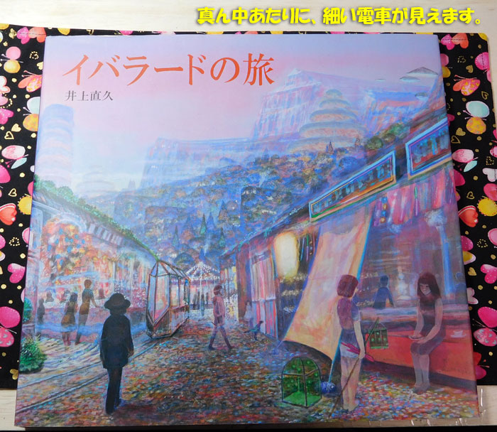 私が「ブラタモリ 花巻」の回を見て、細い電車がとても気になっていたわけ。それは、思い入れのある絵本に出てくる電車と雰囲気がそっくりだったからです。これは、表紙。わかりにくいかもしれませんが、真ん中少し左寄りに、細い路面電車が走っています。表紙に使われている絵には、左側にまだ続きがあって、街中観光をしているような細い電車も描かれています。つないでみると、こんな風景。後ろの方には、ぼんやりと、まるっこい超巨大な建物群、街中には光と色があふれています。ここは、イバラードなんですよ。イバラードには、こんなアーケードもあります。このアーケードの絵の左奥にも、細い電車が見えますね。この絵本を知ったのは、先にシンフォレストという会社のマルチメディアCD-ROMを買っていたからです。私はパソコンで楽しむために、このシンフォレスト社のCD-ROMを、天神のビッ〇カメラにいくたびに購入していたのでありました。そして、CD-ROMを挿入して楽しむだけでなく、中からデータを単独で取り出して、使われている画像とか音楽などを、個別に楽しんでいたの。そんな中に「イバラードの旅」というCD-ROMがあって、画像を何度も見ているうちに絵本も欲しくなって、買いました。すると、CD-ROMには入っていない絵もあって、ますます大好きになりましたよ。これは、裏表紙の中央についている細い電車なんか、カブトガニみたいな雰囲気で、可愛いです。この絵本には、たくさんの乗り物が出てきます。「ぼく」が最初に乗り込んだのは、もう少し大きな光る電車。左側です。右のは、すれ違った電車このターミナル駅で、小さな細い電車に乗り換えます。(右の方ね)どんどん坂を上っていき、坂の一番上は、市場の屋上。「ぼく」が小さな電車から降りて、市場に入ります。見にくいので、右側の拡大版ね。そして、駅前に出ると、すごく広いです。たまたまやってきた「イバラード」を、「ぼく」はいろいろと見て回ります。アーケードは特に美しいですね。いろいろ見たあとで、街はずれにやってくると、こんな感じ街はずれで見つけたお店 (これが、夜空屋)「夜空屋 あなたの探している場所はこちらです どうぞお入りください」という看板のあるお店に入ったら、そこは広い草原になっていました。振り返ってみると、今出てきたところには、「市場屋 あなたの探しているものはこちらにあります どうぞお入りください」という看板のついたお店。そのまま、あたりを見回してみると、そこは「ぼく」の家の近くのくさはらで、見慣れた街灯のところを曲がるとお母さんが炊事をしているなつかしい灯りが見えました。振り返ったら「市場屋」は夕もやにとけていました、というようなお話です。CD-ROMでは、絵にあわせていろんな音や音楽が流れて、それはそれは素敵なものでしたよ。たぶん、今のパソコンでは動かないのではないかなぁ。イバラード関連のCD-ROMは他にもあったので、それも買っています。図鑑になっているものとか、その他の場所の絵などです。この絵本以外にも、「細い電車」の絵はたくさんあって、こんな感じ。作者の井上直久さんは、コミックスでも「イバラード」のことを描いていらっしゃいますし、たくさんの画集も出されています。ほとんどすべて買ったのではないかなぁ。 井上直久 ギャラリーこの真ん中の絵をクリックすると、たくさんの井上さんの絵を見ることができます。細い電車も出てきますよ。