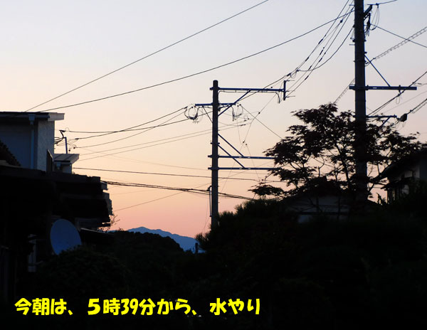 今日の福岡の日の出は、5時31分だったらしい。5時から起きて準備していたけど、さすがに暗い中庭に出るのはいやなので、少し明るくなるまで、待っていました。水やりを始めた頃は、まだ日陰だったけど、だんだんと陽が射してきて・・・庭の花たちが、スポットライトを浴びたように、色鮮やかになっています。ミニ椿エリナの葉も、朝日でキレイな色に見えました。電線に、ツバメがとまっていました。以前見かけたときよりも、少しおとなっぽくなっています。嘴の下、喉元が、朝日に照らされて赤い。でも、尾羽がまだまだ伸びていないので、これは、若者です。今朝は、いつもより少しだけ早く庭に出ました。それは、8時になったら、家を出て病院に行くつもりだったから。今回は、乳腺外科と婦人科の受診日が、一週間ずれていたんですよ。今日は婦人科で、内診もありました。組織を採って、細胞診をされるのです。検査結果は、二週間後くらいに、封書で届きます。その封書の表書きは、自分で書くのですが、私が住所を書いていたら受付の看護師さんたちがヒソヒソと、「字がキレイ・・・」と言っているのが聞こえてきました。それで、張り切って、さらに美しく自分の名前を書きあげて、「はい」と、渡したら、二人して「字がキレイですね~」ですって!!なんか、くすぐったい気分でしたよ。38年間も、人前で文字を書く仕事をしていたからね、丁寧に、基本通り書くのは慣れています。また、字の練習をしたくなりました。(o^.^o)y婦人科は、次からは、4ヶ月に一度の受診、その後は、半年に一回になるそうです。乳腺外科の方は、ホルモン抑制剤を処方してもらう関係で、必ず、3か月に一度の受診が必要。(あと3年)今度からは、同じ日ではなくなる、ということですね。では、昨日の晩御飯。お寺からナスをもらってきていたので、ナス料理。焼き浸しにしました。そして、メインは、二割引きだったおから料理。おからって、安いから、二割引きでも、そう違わないのだけど、なんか、つい買ってしまいます。お惣菜コーナーの唐揚げも、ひと品に加えました。ノンフライヤーで焼くと、余分な油が落ちるので、気に入っています。おからのおかげで、お腹いっぱいになりました。ナスも、美味しいね。