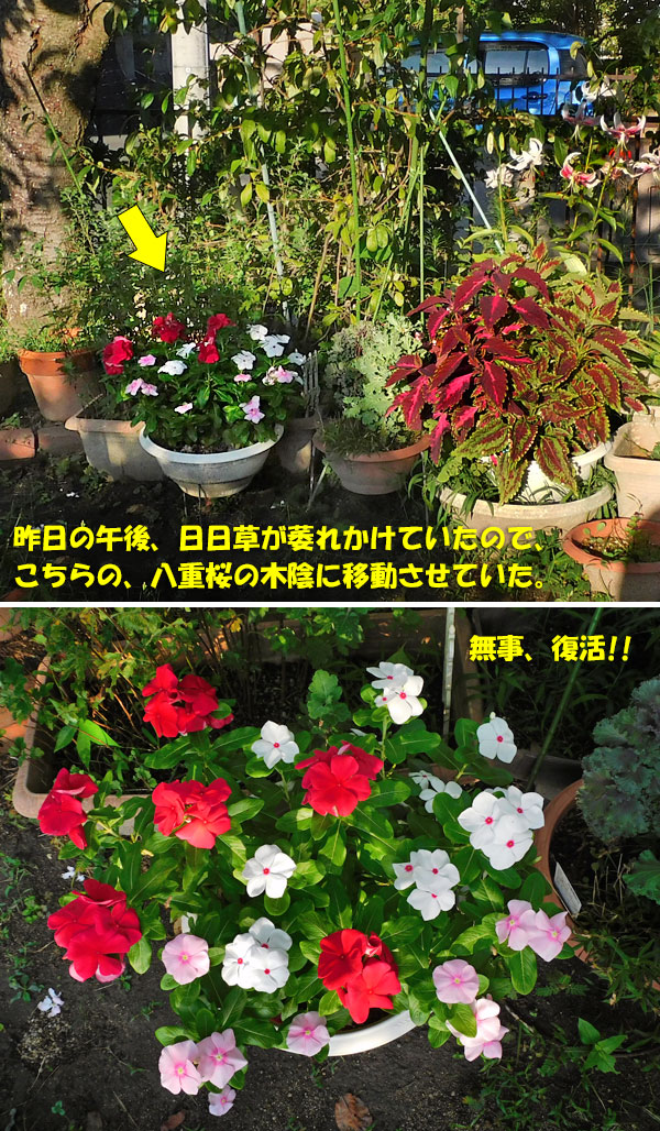 昨日、急に暑くなったせいか、日日草が萎れていました。葉っぱが丸くなって、花びらも、たたんだ状態に・・・こら、いかん。すぐに、八重桜の下の木陰スペースに持っていきましたよ。で、今朝の様子がこれです。よかったぁ、葉っぱも花も、ちゃんと広がっていましたよ。まだ暑さは続きそうなので、しばらくは、ここに置くことにします。でも、日日草を移動させたので、花鉢コーナーが、ちょっと寂しくなりました。移動ついでに、ずっと気になっていた挿し芽成功のまま、挿し芽用の土が入った鉢で育てていたビスタミニを、植え替えました。挿し芽用の土は、肥料がまったく入っていないので、芽を出すにはいいかもしれませんが、今後の成長はのぞめません。同じ鉢なので、わかりにくいと思いますが、これには、普通の「花と野菜の土」と肥料が入っています。これから、いっぱい茂るといいな。ビスタミニの隣のペンタス。赤と白の花も可愛い。ペンタスは、草花ではなく、低木なのだそうです。そういえば、日日草もキョウチクトウ科の半低木。全草に毒があるので、触ったあとはよく手を洗った方がいいらしい。大量に食べると、中毒で亡くなってしまうこともあるらしいけど、私は、食べないからね。気になっていた夏水仙は、だいぶ伸びていたけれど、咲くのは、まだのようです。明日くらいかな?これは、朝日を浴びたトレニア。今日気づいたのですが、今年の1月に植えていた「西王母」椿に、ひとつ、つぼみらしきものがありました。小さな苗だったので、花がたくさん咲くのは、まだまだ先のことでしょうけど、なんか、一個だけ咲くかも。とにかく、9月に咲き始めて、次の年の春までずっと花を咲かせるらしいからね。ものすごくお得な椿です。大きな木に育つのが、楽しみです。これは、西王母椿から、ピョンッと飛び出したイナゴ。ハネナガイナゴという種類のようです。椿の葉を食べたりするんでしょうかね・・・最後のおまけ。昨日の晩御飯。とろけるチーズのシート状の物が、賞味期限が迫っていたので、チクワと一緒に焼いてみました。旦那が、ビールのおつまみにしながら食べていましたよ。