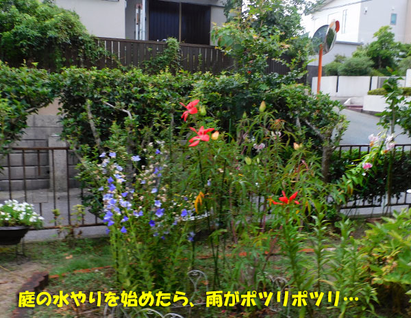 今朝も、いつも通りに起きて、庭に出て水やりを始めた。でも、あら? なんか、水が当たる。ホースの水じゃなくて、これは、雨??地面を見たら、雨粒が落ちた跡がついていました。でも、大したことはない。雨が降ると信じて水やりをやめたら、このあと晴れてしまうかも。というわけで、雨がパラパラ落ちる中、水やりをしましたよ。まあ、いつもより少な目でしたけどね。水遣りを終えて、写真を撮ろうとしたら、ちょっと大粒になったので、ほとんど撮っていません。部屋に戻ってから、天気予報を確かめたら、まあ、なんということでしょう、今日の午前中は雨、雨、雨の予報。びっくりです。たしか、雨が降るのは、木曜日くらいから、だったはず。ま、降ってくれた方がありがたいので、いいけどね。では、ちょっとしか撮っていないけど、庭の写真です。昨日は咲いていなかったからね。今日のモミジアオイは、3輪でした。花鉢コーナーには屋根があるので、ちゃんと水やりしておかなくては。昨日の黄赤のバラが、もう咲いていましたよ。10時少し前から、雷鳴がずっと響いていて、ついに、10時頃からは、けっこうな量の雨が降っています。ありがたいことです。天の恵みの雨に、感謝!!まさに、慈雨、喜雨ですね。では、昨日の晩御飯ね。昨日は、焼き飯でも作ろうかな、と思っていたら、旦那がゴーヤを買ってきてくれたので、急遽、ゴーヤ料理に変更。「1本が50円やったけん、つい、4本も買ってしまった。」と言っていましたよ。切ってみたら、ちょっと柔らかくて、タネの周りが赤くなってきていた。もう、だいぶ熟れているということね。なら、全部使っちゃえ!!半分くらいをゴーヤチャンプルーにして、残りは、ゴーヤサラダにします。家にあったもので、すぐにできました。今回のゴーヤは、少し分厚く切っていたけれど、熟してきていたせいか、あまり苦くありませんでした。では、また縫い物をするために準備しているもの。キッチンテーブルは広いので、こういう作業に向いています。これは、コーラスの仲間へのお土産になる予定。朝突然降ってきた雨は、途中で雷鳴とともに土砂降りになったけど、今はまた、静かになっています。明日は晴れて、夜からまた雨が降る、という予報ですが、明日の水やりはどうしましょうかね。花鉢だけにしておこうかしら・・・