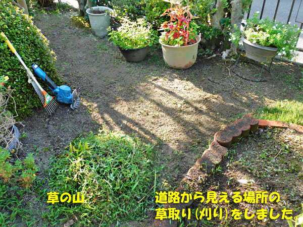 昨日は、最近の草取りサボりがバレたので、今朝の庭仕事は、道路から見える場所の草刈りでした。(昨日の夕方土砂降りだったので、水やりはお休み)電動バリカンを手に持って、丁寧に刈り取り、切れた草を、熊手でかき集めました。この草の山をごみ袋に詰め込んで、もう少し、きれいにしましたよ。またすぐに伸びてくるとは思いますが、ひとまずね。ここが、一番のぞき込まれる場所なんです。では、新しいパソコンの紹介です。元使っていた方のが上のパソコンで、届いたばかりのが、下のほう。今日は、無事、アドビのPhotoshopelements 15をインストールできたので、これからは、写真の加工も、二階でできそうです。では、作っていたこぎん刺しバッチですが、これだけになりました。なんだか、似たような模様ばかりですね。それでは、昨日の晩御飯の紹介です。ゴーヤの酢味噌和えを作ってみました。いつもとは違うスーパーで買ったお惣菜「大判アジフライ」をノンフライヤーでカリッと焼いて出したら、とっても美味しかったみたい。私は、今朝、オーブントースターで焼きなおして、いただきましたよ。昆布ポン酢と、どちらにするか迷ったけど、結局、いつものゴマドレッシングをかけて頂きました。美味しかったぁ。