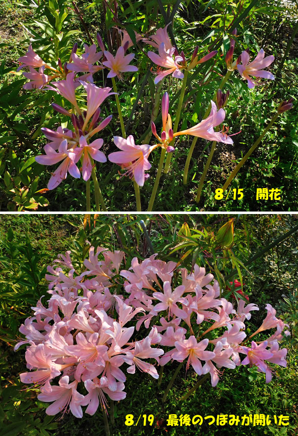 今朝、庭の水やりをしていたら、なんとなく、ザッザッという音が聞こえた。見ると、上の家の奥さんが、道路をはわいて(はいて)おられました。私の母と、そんなに違わないお歳です。「うるさいでしょ? すみませんねー。」と恐縮されていましたよ。屋根の工事が始まって、一昨日は、瓦を投げ落とす音がけっこう響いていたからね。昨日からは、割と静かな作業です。私が「瓦を取り換えるんですね。」と尋ねたら、「いえいえ、瓦は焼き物なので、とても丈夫なんだけど、瓦の下が傷んでしまって・・・」とかおっしゃっていました。なんでも、家を建てたころに、ちょうどオイルショックだったので、旦那さんが、建築費をケチってしまったのが原因らしいです。うちは、積水ハウスのモデル住宅で、この住宅団地ができたときの、見学とかにも、使われていた家。リビングがでっかい、3LDKの平屋だったし、屋根は瓦がのっていませんでした。そんな昔の話なんかもしていたら、うちの庭を見られて、「いつもキレイにしておられたけど、やっぱり、草が生えていますねー。」と、言われてしまいました。普段は、雑草とかほとんど道路から見えないように、きちんとしていたけど、ここ最近の雨続きだったとき、そして、その後の蒸し暑い日々、ついつい、草取りを中途半端にしてしまっていたんですよね。サボっていたのが、バレました。これは、上の家のブロック塀に生えているランタナ。伐っても伐っても、またすぐに、この状態になってしまいます。とってもお花がかわいいので、ひと枝いただいて、挿し芽をして育てています。そうそう、西側のフェンスのところに、実生で育った鹿の子ユリが今年は、ついに花を咲かせていたんですよ。鹿の子ユリは、毎年、実ができるし、タネも取れます。それを保存しておいても、どうせ忘れてしまうので、そのあたり一帯に、ばらまいているのですが、これは、その中の一つがついに咲いた、ということです。ほかにも、花がまだ咲かないで、茎と葉だけの鹿の子ユリもあります。この表を見ると、普通に種まきすると、5年目でようやく花が咲く、ということのようですね。つまり、フェンスのところの鹿の子ユリは、5年目。昨年までは、茎だけでしたもの。これからは、毎年咲いてくれることでしょう。それからね、フェンス際で見つけた花、もう一つ。この猛暑の中、なんと、アジサイが咲いていたんですよ。びっくり!!ほかにも、万両の実が、いっぱいできていました。これは、こぼれ種の葉鶏頭。光が透けて、美しかったので、パチリ。コリウスも、葉が美しいです。寄せ植えのコリウスは、いつも同じ向きだと、育ち方が偏るかな、と、思って、鉢の向きを変えてみました。この「ピーターグリーン」という名前のついたコリウスは、ずっと、向こう側にあったので、なんか育ちが悪い気がする。これは、木陰に置いた、斑入り葉ランタナ・イエローの花。朝日が、まるでスポットライトみたいに当たっています。きれいな黄色です。最後に、昨日の晩御飯と、私の朝ごはん。ナスがいっぱいあったので、みそ炒め煮にしました。このきゅうりは、くるんくるん曲がっている物ばかり6本入って、200円だったので、買ってきていたもの。ちくわに入れるのには、向きませんが、スライサーで切るなら問題なし。最後に、パソコンのこと。二階のデスクトップパソコンは、2016年の冬に買っていたもので、2年前くらいから、とっても起動が遅くなり、昨年くらいからは、入力がとても変になっていたんです。(例えば「うどん」と入れようとすると「うん゛と」と入るような)いつ壊れても困らないように、一階の居間に、ノートパソコンを置いて、そちらで、写真の管理とか、画像処理とかをしていました。でも、なんか、Windows10はサポートされなくなる、とかいろいろ言うので、この際、と思って、二階用のデスクトップパソコンを買いました。これまでと同じ一体型なので、場所を取りません。それに、今回は、整備品(中古)の富士通パソコンにしたので、3万円からおつりが来るくらいの価格。いつまで使えるものかわからないけれど、今のところ、快適に使っています。Office2019も入っているけれど、今は、使わないからねー。新しいパソコンで、GoogleChromeを開いて、同期させたから、すぐに今まで通りの使い勝手。あとは、それぞれのサイトに、再ログインするだけでした。とにかく、起動が早くて、入力ミスがない。画面もキレイで、満足しています。