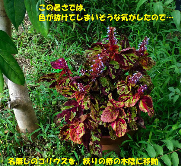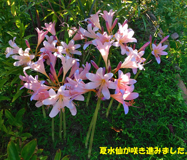 こんなに毎日、ものすごい気温なのに、庭の花がちゃんと咲いてくれていて、嬉しいです。ただ、私の方が暑さに耐えられず、じっくり草取りをしていないから、取りにくい場所が、草ぼーぼー。そのうち、曇りの日に、ゆっくり草取りしましょうかね。あまりにも暑いせいか、木陰に置いたつもりでも日が当たっているせいか、名無しのコリウスの葉の色が、ちょっと薄くなってきた。それで、絞りの椿の木陰に置いたけど、ここ、草ボーボー。奥の方とか、すぐに手が届かないので、なんか後回しになってしまう。生垣の陰のふわリッチは、生き生きしています。これから先、どんどん夏の暑さは増していきそうだから、庭木を透かすのは、ちょっと控えめにしようかな。木陰の範囲を少し広げよう。でないと、庭の植物たちが、可哀そうですね。では、そんな暑い中、キレイに咲いてくれているお花たち。まずは、夏水仙。水遣りした直後なので、水滴がついています。夏水仙は、水仙の仲間ではなくて、彼岸花の仲間。だから、分球で増やします。せっかく、おしべやめしべがあっても、実ができない。ランタナも、さすが、強いですね。これは、挿し芽していたことを忘れていた鉢。今朝、花のつぼみを見て、あっそうか、と思い出しました。甘夏の木の下にずっと放置していた鉢ですが、ちゃんと育っていて、嬉しいです。避難させていた斑入り葉ランタナ・イエローにも、ようやく花が咲きはじめました。最後に、庭の五か所で、いっぱい花を咲かせている鹿の子ユリ。八重桜の下や、生垣の木陰で、毎年元気に咲いてくれます。鹿の子ユリには実ができて、たくさんのタネがとれるので、周り中に、適当にばらまいていますよ。それで、毎年、花が咲かない茎だけの鹿の子ユリが交じっています。5年たったら、花を咲かせてくれることでしょう。最後に、昨日の晩御飯。昆布塩サバの「無双」を焼きました。私と旦那は、胴体の部分で、息子たちは、食べやすいしっぽの方。今回、キャベツがいっぱいあったので、キャベツを使って「すき焼き風煮込み」を作りました。牛肉・玉ねぎ・ぶなしめじ・糸こんにゃく・厚揚げ入りで、とっても美味しかったけど、やっぱり、白菜の方がいいなぁ。