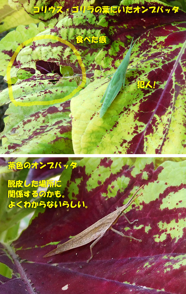 昨日、えらく大量に雨が降っていたし、今日もまた雨の予報。というわけで、水やりする気はなく、カメラだけ持って、庭に出ました。そしたらね、玄関前にいっぱい咲いているランタナに、オンブバッタ。ま、ランタナは花も葉もいっぱいあるから、食べてもいいよ。なんて思いながら見ていたら、お尻の先に黒っぽいもの発見。これ、ウンチだよね。ひょっとしたら、後ろ脚でけ飛ばすところを見られるかも・・・と、思っているうちに、なんと、け飛ばしてくれちゃいました。目にもとまらぬ、というわけではなく、ちゃんと肉眼で見えるスピードでしたよ。途中で、あ、動画で撮っておけばよかった、と思ったけど、もう遅い。ウンチが出始めてから、け飛ばすまで、20秒くらいかも。この後、またウンチが出てきたら動画を撮ろう!! と待っていたけど、さすがに、もう見られませんでした。昨日のブログに書いていなかったら、オンブバッタのお尻を観察することもなかったでしょうから、まあ、ラッキーといえば、ラッキーなのでしょうね。ほかに、ウンチしそうなオンブバッタがいないかと探していたら、ササグモのメスがいました。がんばってねー。花鉢コーナーにも、オンブバッタが大量にいるので、見に行ったら、彼女、発見。翅がまだ生えていませんから、あと一回は脱皮しそうですね。おなかがだいぶ大きくなってきています。間違いなく、メスです。そのあとは、お花の写真を撮ってまわりました。生垣の紫陽花の花は、まだちゃんと咲いていましたよ。昨日のピンクのミニバラに続いて、白のミニバラも開きました。我が家の百日紅も、順調に咲き進んでいます。下の方のつぼみは、まだまだだけど・・・寄せ植えのコリウスの花穂が伸びて、花が咲いていました。そうそう、昨日、びっくりしたことがあったんですよ。私たちのコーラスの指導者の先生は、今、娘さんが二年間の予定で暮らしているアメリカに、ご主人と一緒に遊びに行っていらっしゃるのだけど、コーラスのグルーブラインに、アメリカにいる先生からのコメントが入っていたの。えぇーーーっラインって、国際電話みたいなことができるんですね。先生は、ピッツバーグにいて、朝は17℃、夕方29℃、という過ごしやすい環境で、夏休みを満喫されていました。先日の私たちの次の曲についての話とか、書いていたので、それに関しての、先生のコメントも来ていました。この次、9月の後半には、イタリアに歌いに行かれるのだけど、その時も、ラインで連絡があるかもしれません。本当にびっくりです。では、最後に、昨日の晩御飯ね。我が家の食卓には、すっかりおなじみになったほうれん草の白和え。今は、いつでも味噌入りで、美味しいです。