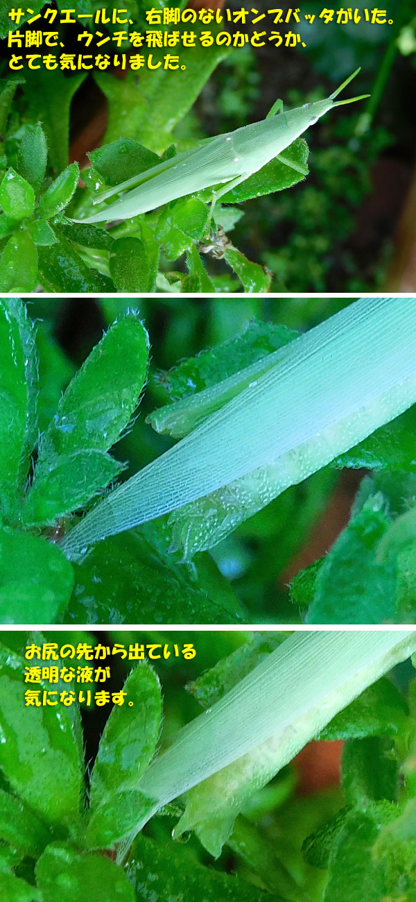 今朝も、庭に出て水やりをした後は、お花と生き物の観察。このオンブバツタは、大人の雌ですが、昨日のせた翅の短いバッタが、脱皮した姿なんじゃないかな・・・なんて、考えていたら、あれ、右脚がありません。これまで見たバッタたちは、みんな右脚でウンチをけ飛ばしていたのに、このバッタには、右脚がない。なら、左脚でけ飛ばすのか?でも、左足で支えているのに、その足でけ飛ばすことなんてできるのか?それで、気になって、ずっとお尻の先を見ていたら、なんか、もぞもぞした後に、透明な液体を出していましたよ。この写真の方がわかりやすいかな?片脚でも、ぴょん、とジャンプできたけど、け飛ばすのは、できるのか。けっこう長い間、このバッタを観察していました。アマクリナムは、咲きそうで咲かない。毎日、少しずつ成長しているのは、確かなんだけど。千日紅は、赤の花が増えてきました。もう一度切り詰めた方がよさそうだけど、そのままになっている、ももいろハートとビスタミニ。今日は、庭の通路を中心に、草を刈りました。歩きにくくなるからね。では、昨日の晩御飯ね。コーンごはんは、よく噛んで食べましたよ。(^▽^)/では、今日作ったものね。なんとなく作った「ネコの顔のスタンプ」何に使おうかなぁ。