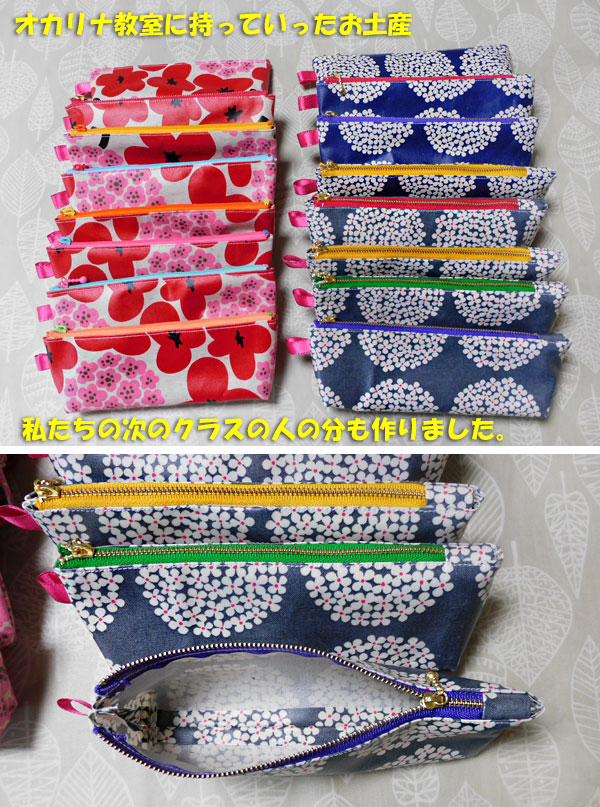 今朝起きたら、庭の土が濡れていました。また雨が降っていたようです。それで、今日は水やりをせず、何か所か気になる草を抜いただけ。そんなに汗をかかないうちに、終了してしまいました。今日はオカリナ教室なので、9時には出かけないといけないのですよ。というわけで、お土産を持っていきました。結局、この量になりました。ミシン縫いを始めたら、楽しくて楽しくて、止まらなかった・・・この2種類は、布も違いますけど、ファスナーの処理が違います。端っこに、布をつけているかどうか。どちらの方法も、楽しかった。 ミシン縫い 作りだしたら 止まらない ポーチ、ペン入れ 山ほどできてオカリナ教室が始まる前に、みんな揃っていたので、先に見てもらって、選んでもらいました。私たちの次に、同じ先生のクラスがあるので、終わったあとに、その人たちにもプレゼントしました。材料さえそろっていれば、7か所縫うだけなので、1個できあがるのに、15分くらいでしょうか。あっという間に、量産できます。コーラスの人の分も出来上がっているから、もうペンケースは終わりかな?次は、何を縫おうかしら・・・そうそう、オカリナ教室では、ソプラノCの楽器を持ってきてくださったので、私とオクターブ違いで、ユニゾンでの演奏。もう、とても美しくて、気に入ってしまいました。 youtubeより「テルーの唄」オカリナ二重奏この動画の、1分50秒あたりから、とても高い音が加わっています。それが、ソプラノCの音色です。今日はいつもと違う教室で演奏したので、とても響いて美しかった。いつもは、学習室だからね。エアコンの効いている部屋で、みんなで演奏を楽しみました。教室が終わり、次のクラスの人にペンケースをプレゼントしてから、建物の外に出たら、なんと、地面が濡れていましたよ。どうも、練習しているときに、雨が降っていたらしい。それから、買い物をして、自宅に戻ってしばらくしたら、音を立てて、雨が降り出しました。びっくり!!その後も、降ったり止んだり、晴れたり、曇ったり。変なお天気です。窓辺の椅子に座って、外の様子を見ていたら、日日草に、キアゲハのメスがやってきました。今日は、パセリがもう幼虫たちに食べつくされていたから、卵を産む場所がなかったかも。ふと見ると、その向こう側には、ツマグロヒョウモンのオスがいました。こんなお天気では、蝶たちも、どこにいようか、迷いそう。そうそう、赤葉紅花トキワマンサクの花がまた咲いていました。また、この紅色のちゅるちゅるリボンを見られて、嬉しい!!ペンタスは、また白の花が終わって、赤とピンクだけになりました。なんでかな、順番があるみたいに、咲き分けています。相変わらず、迫力満点のスーパーチュニア・ビスタミニですね。縫物が一段落してしまったので、次に何をしようか、と悩み中。