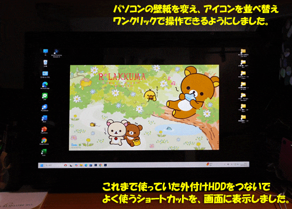 中古だけど、新しいパソコンがやってきて、とってもワクワクしています。昨日は、また、いろんな設定を自分に使いやすいようにしました。気分を変えるために、壁紙をリラックマにして、アイコンを自由な位置に並べられるように変えました。そして、元のパソコンの時から使っている外付けHDDの、よく使うフォルダごとに、ショートカットを作って、右側に配置。これで、いつでも開けます。昨日インストールしたPhotoshop elements 15は、こんなの。私は、これを、写真の編集専用に使っています。トリミングしたり、画像をつなげたり、文字を入れたり。パソコンを使い始めた1990年代から、ずっとPhotoshop Elements を使っているので、バージョンアップしても、使い勝手は同じ。ブログ用だけでなく、年賀状のイラスト作りとか、壁紙作りなどにも便利に使ってきました。昨年からは、もう年賀状じまいにしたので、シールも作らなくなりましたが、ブログをやっている間は、まだまだ楽しめそうです。この画像加工をしているとき、上の家の方から、すごい音がしてきました。もう、瓦は全部落としていたはず・・・と、思ったら、二階の瓦を落としているのでしたよ。買い物に出かけたときに、見えたのは、瓦が三枚並んでいるような形のプレートでした。よそのお宅のことですから、尋ねるわけにもいかないからね。たぶん、軽量の屋根材なんだろうと思います。これまで、いっぱいいたスズメたちは、もう隙間に入れないかも。では、昨日の晩御飯ね。豚肉1パックと、玉ねぎ1個を水炒めしてから、ゴーヤ1本分と、硬めの豆腐を入れました。最後に、卵5個分の溶き卵を入れて、とじて、出来上がり。いつもと、ちょっと変えてみたのは、味噌を入れてみたこと。ついでに、塩糀も入れてみた。少しだったので、あまり変化はない気もしたけれど、とっても美味しかったので、よかった。晩御飯は、前日のゴーヤの酢味噌和えが残っていたのと、2個480円で買った「幸水ナシ」を添えました。では、後回しになったけど、庭の花たちね。しばらくお休みしていたミニバラが、咲いていましたよ。日日草は、だいぶ背が高くなりました。葉ボタンは、なんか、これから枝が伸びてきそうな雰囲気になっています。ネットで画像検索したら、こんなのが出てきますよ。三年くらい前に、いいところまで行ったんだけど、ヒメナガメという虫にやられて、ダメになってしまったんですよね。今回は、そのリベンジです。それから、最初のアドビの画像に出てきていた写真のモミジアオイね。こんな感じに、写真に→を入れたり、文字を入れるのに、とても便利なソフトなんです。Photoshop Elements 15は、お気に入り。