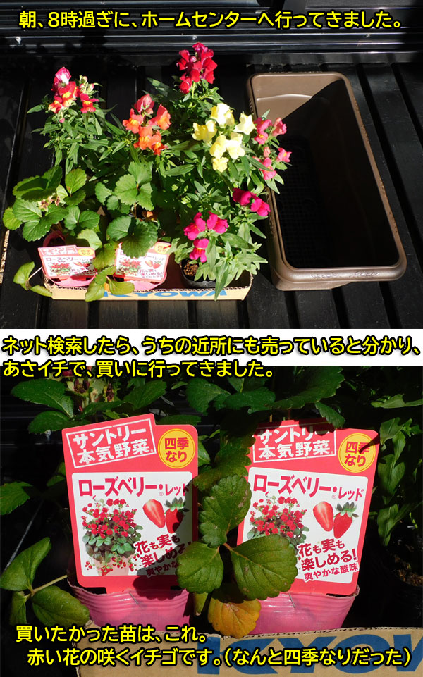 ごねあさんのところで見せていただいた「真っ赤な花の咲くイチゴ」が気になって、ネット検索してみました。すると、サントリーから発売されているではないですか。うちの近くのホームセンターには、サントリーの植物がいろいろあります。これまで見てなかったけれど、野菜苗コーナーにあるかも。というわけで、今朝、開店直後に行ってみましたよ。先日行ったときに、イチゴの苗がおいてあるのを、ちらっと見かけていたんです。それで、そのあたりを見たら、ありました。2ポットあったので、2つとも購入。ついでに、植えるための小型プランターと、先日なかった金魚草が、たくさん並んでいたので、購入。会計のときに、お店の人も、「赤い花が咲くイチゴがあるんですね。」と、びっくりされていました。金魚草のことも、「先日買った金魚草がいっぱい咲いたので、追加を買いに来たら、この間は、1個もなかったんですよ。」と言うと、なんと昨日入荷したばかりだったそうです。ラッキー。というわけで、かえってきてから、すぐに植えました。なんだか、ナメクジがやってきそうな気がしたので、花台に麻縄を張って、プランターを載せられるようにして、地面から離しました。あとで、ナメトリンもまいておかなくちゃ!!花芽はいっぱいあったので、これからきれいな花が咲くことでしょう。すでに、できている実もあったけど、小さいですねー。まあ、食べるつもりはないので、いいけどね。(観賞用にします)サントリーのサイトで、紹介されていました。四季なり品種、というところが、嬉しいです。園芸サイトでも紹介されていました。四季なりの桑の実(マルベリー)といい、この赤花のイチゴといい、この秋は、珍しい物をいっぱい植えました。買ってきた金魚草も植えましたよ。一気ににぎやかになりました。真ん中の奥の、一番花が多いのが、先日植えた分。あとのは、今日植えた金魚草です。(88円)ここに置いていた八重のストックの鉢は、花苗コーナーに移動させました。うっとり眺めていたら、蝶がやってきました。そうそう、庭の見回りをしていたら、金木犀の香りが・・・今日から数日は、香りを楽しめそうです。では最後に、昨日の晩御飯。私の朝ごはんは、一昨日の残り物。甘酢だれを追加して、美味しく頂きました。