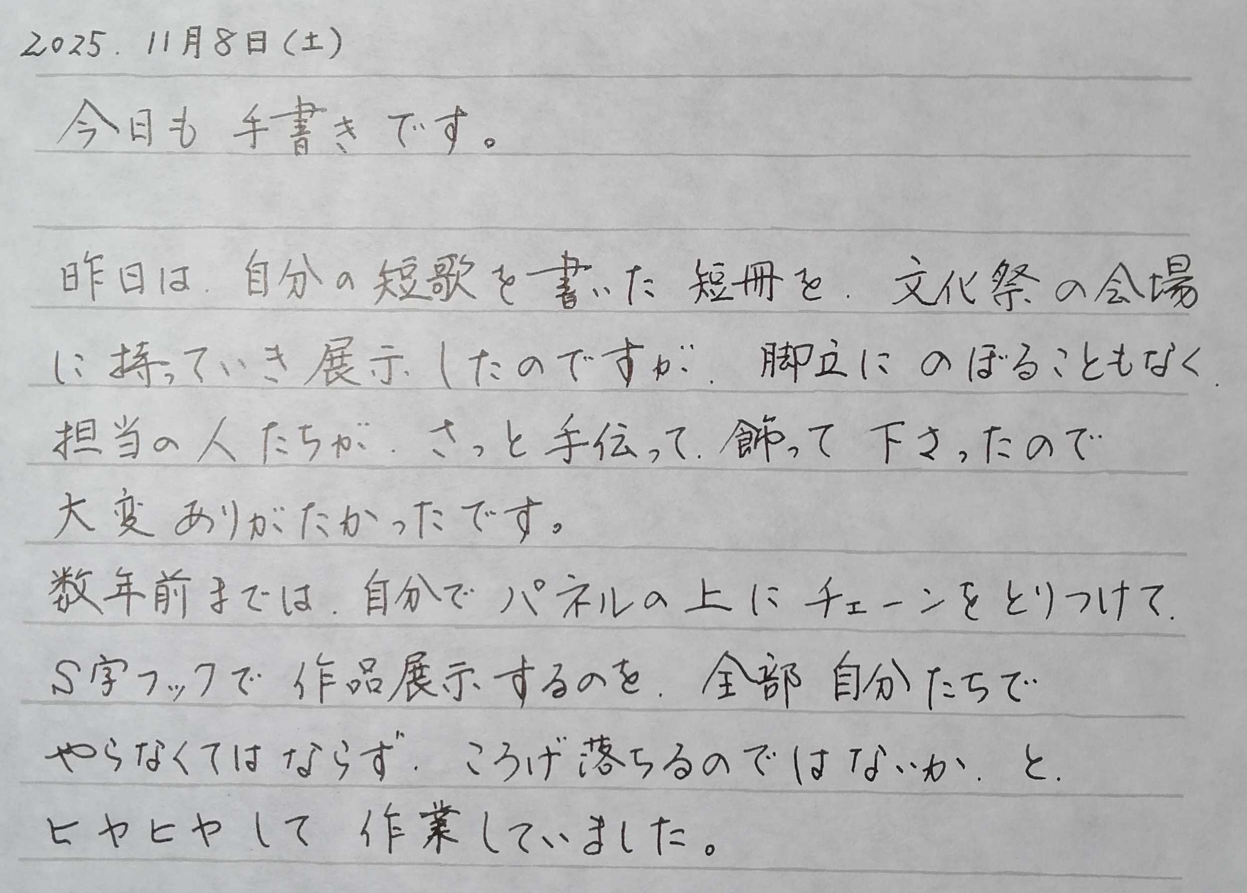 あ、木製の机の書き間違いね。昼からは、短歌作品の短冊を展示しに、会場まで行ってきましたよ。とにかく、暑いです!!