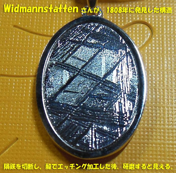 隕鉄を切って、断面を出し、酸で加工して研磨して初めて見える構造です。こんな模様は人工的にはまず作れないらしく、本物の隕石の証明でもあるそうですよ。