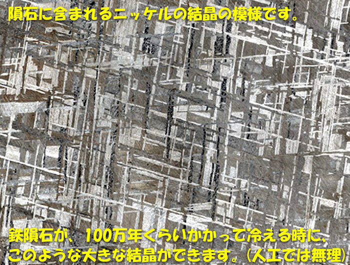 ​成分は、 鉄91.8% ​ニッケル7.7%​ 、コバルト、リン、ガリウム、ゲルマニウム、イリジウム​ など。このうち、 ​ニッケル​ が長い長い時間をかけて(100万年くらい)結晶化したのが、この網目状の模様​ です。