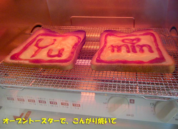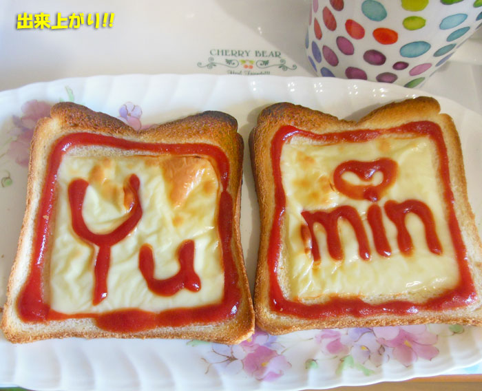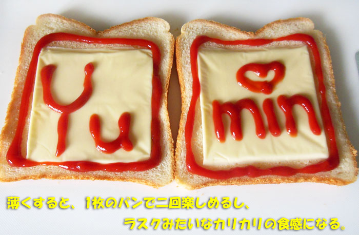 愛用のパン切りナイフで、薄くしてから、とろけるチーズとケチャップで、適当に飾ります。